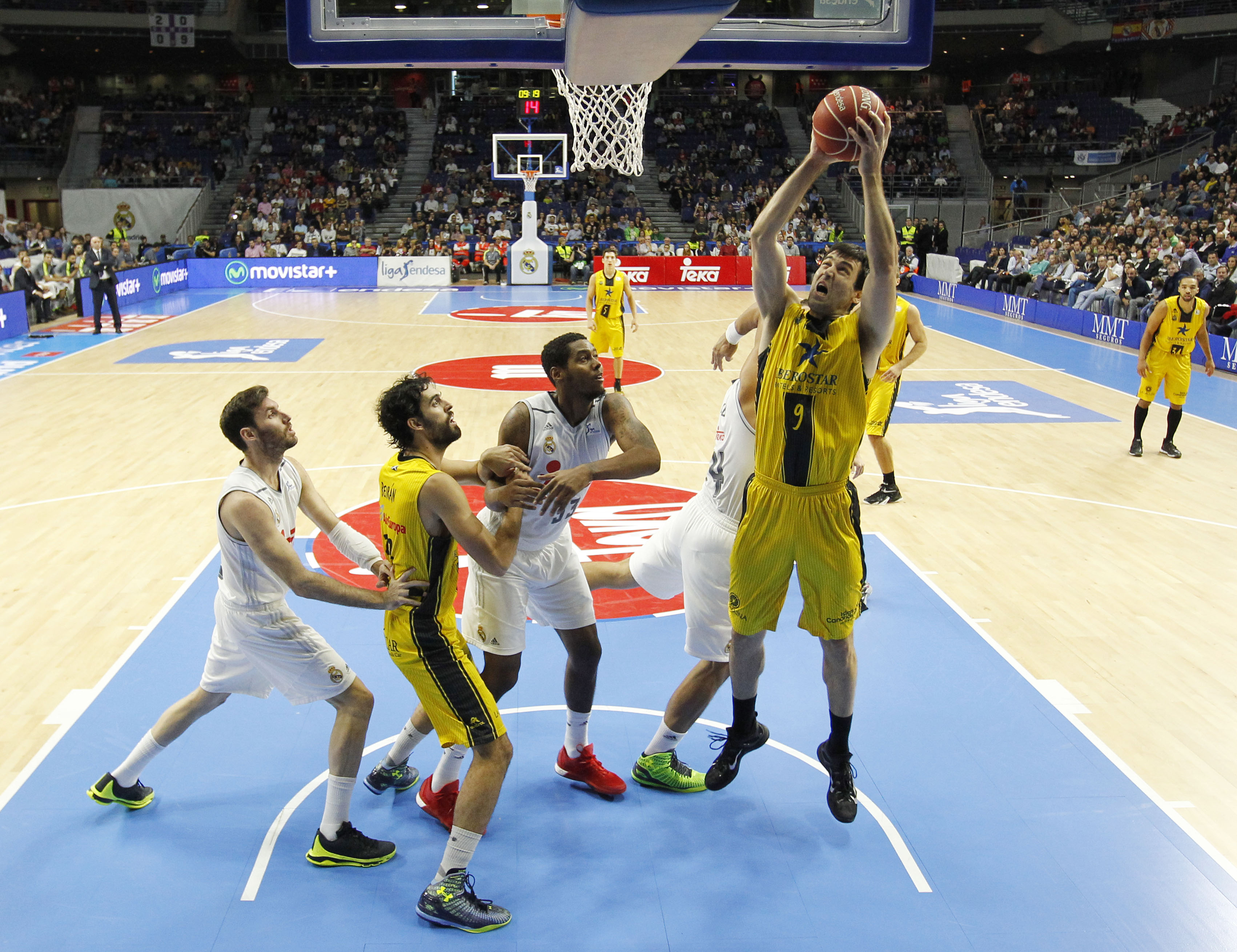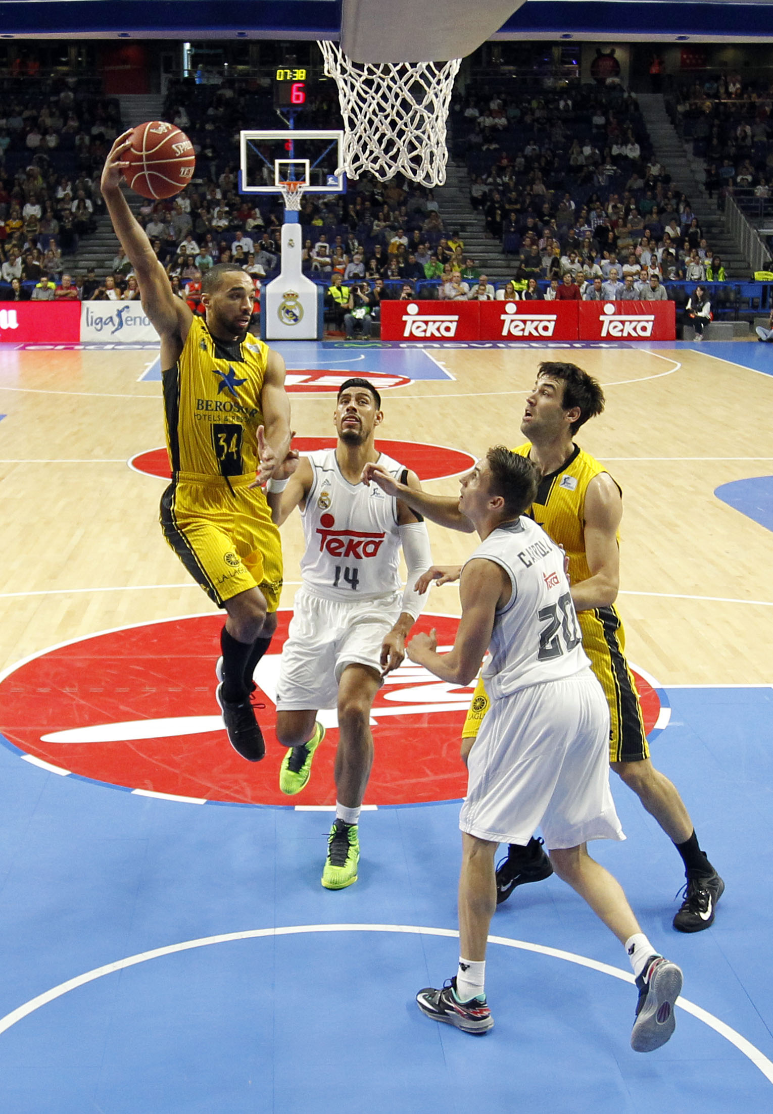 El equipo auriengro aguantó bien la primera andanaba blanca, aprovechando la aportación de Carter y Hanley, que, saliendo desde el banquillo rubricaron un parcial de 2-11 para acercarse en el marcador (28-27). En ese instante, apareció el internacional español Felipe Reyes, pieza clave para incrementar de nuevo la diferencia a favor de los «vikingos» hasta el 54-40 del descanso. Tras la pausa, el Canarias siguió luchando por no quedarse fuera del partido (56-45, tras triple de Nico Richotti), pero las aspiraciones aurinegras fueron borradas por el Madrid.