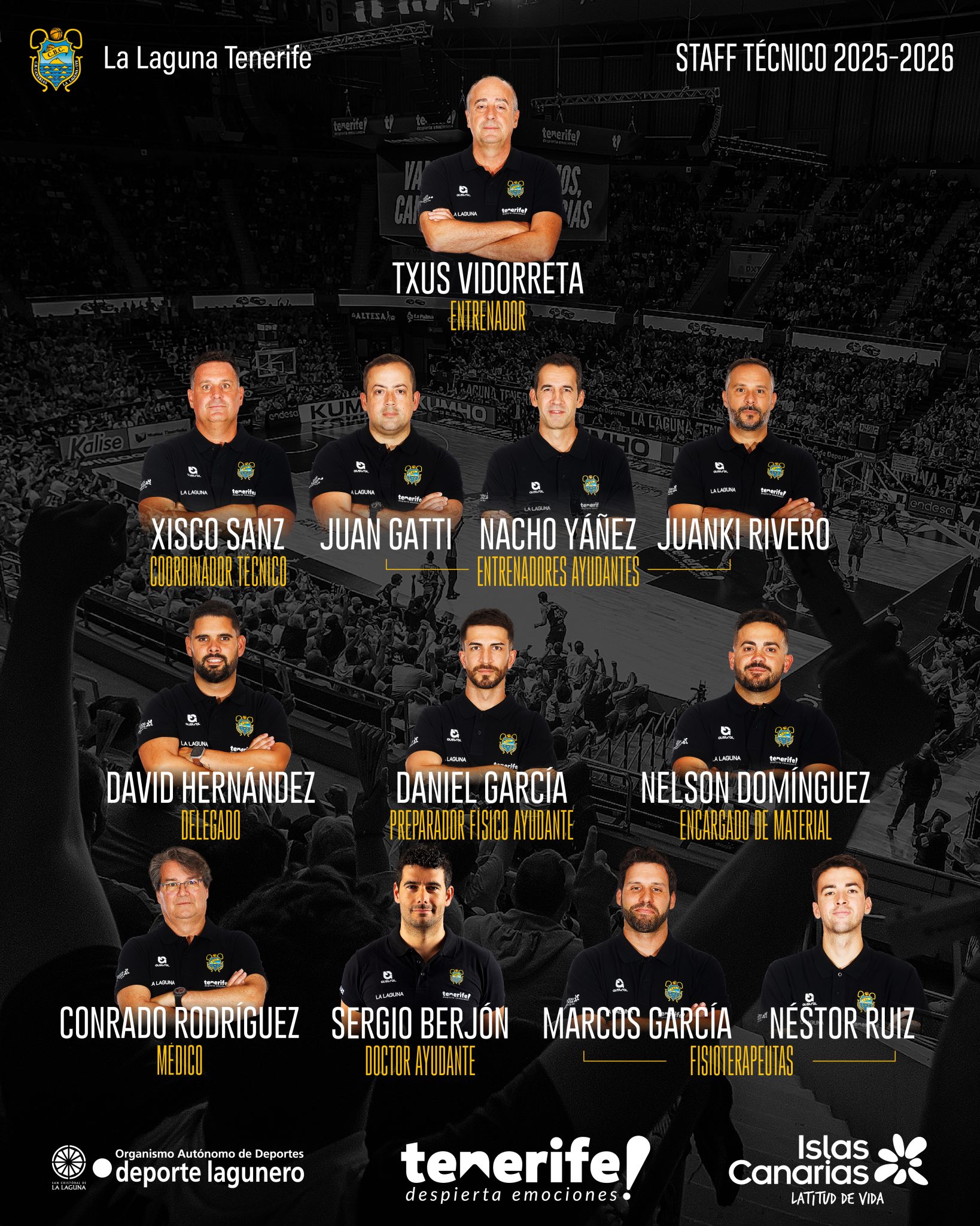 El cuerpo técnico mantendrá a Xisco Sanz como coordinador y preparador físico principal, acompañado por Daniel García Trujillo en las tareas de preparación física. Junto a ellos, continuarán como entrenadores ayudantes Juan Gatti, Nacho Yáñez y Juanki Rivero, piezas habituales en el engranaje del banquillo lagunero.