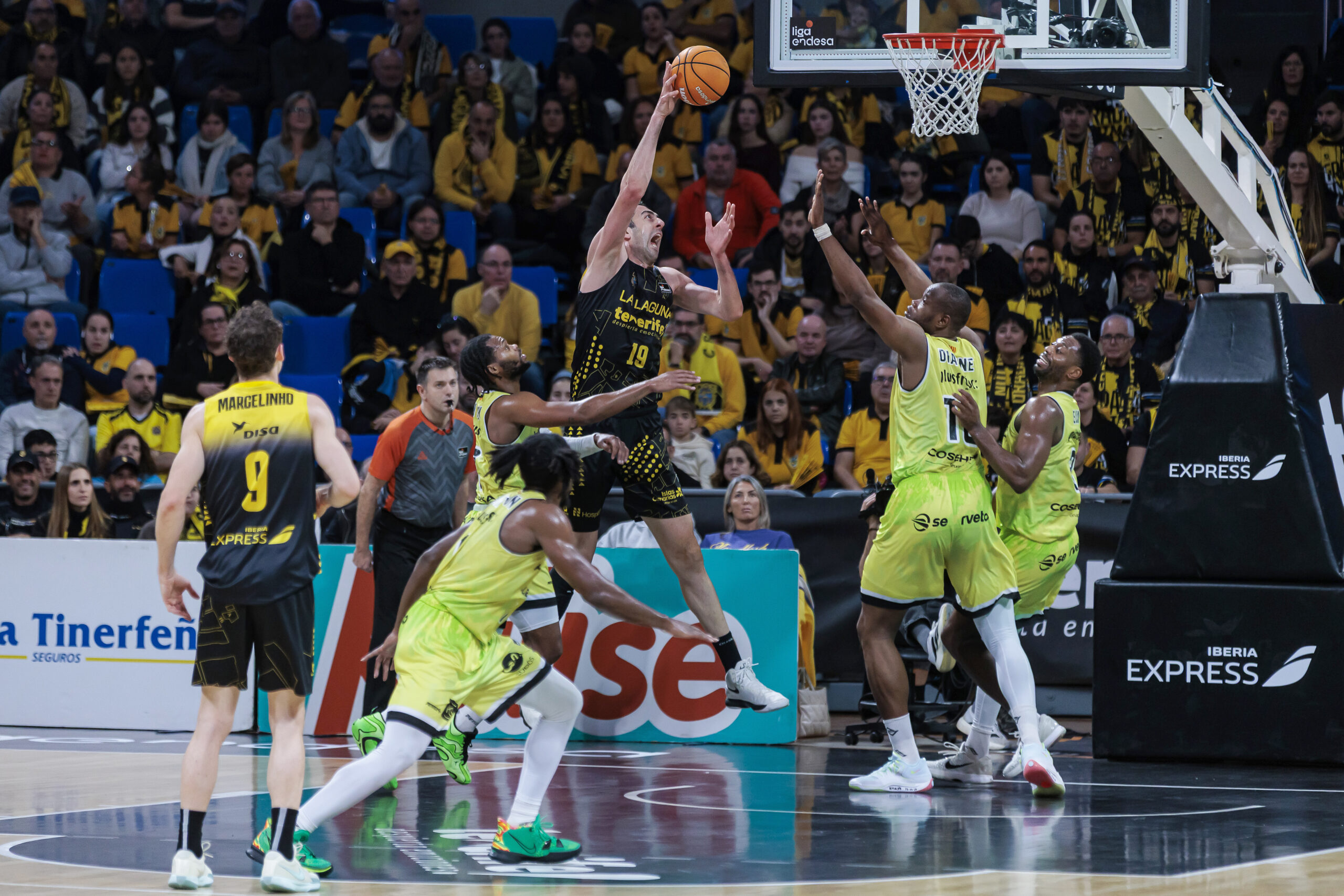 Ahí apareció una de las mejores versiones del equipo lagunero en la primera mitad. La segunda unidad dio un paso al frente, con un Marcelinho Huertas brillante en la dirección y repartiendo juego con criterio. Los primeros aciertos exteriores, dos triples de Abromaitis y otro del propio Huertas, reforzaron la confianza de un La Laguna Tenerife que empezó a sentirse cómodo y a mandar en el ritmo del partido.