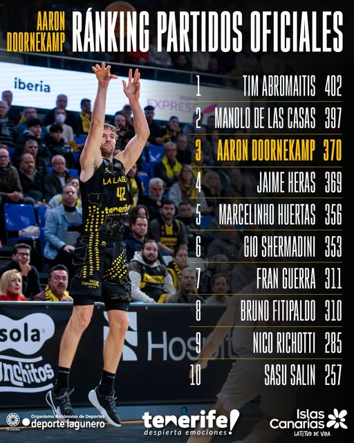 Aaron Doornekamp se ha consolidado como una auténtica referencia del equipo aurinegro. Al disputar 370 partidos oficiales entre todas las competiciones, ha superado al legendario Jaime Heras y se coloca en el tercer puesto en la lista histórica de jugadores con más encuentros, sólo por detrás de dos mitos como Manolo de las Casas (397) y Tim Abromaitis (402).