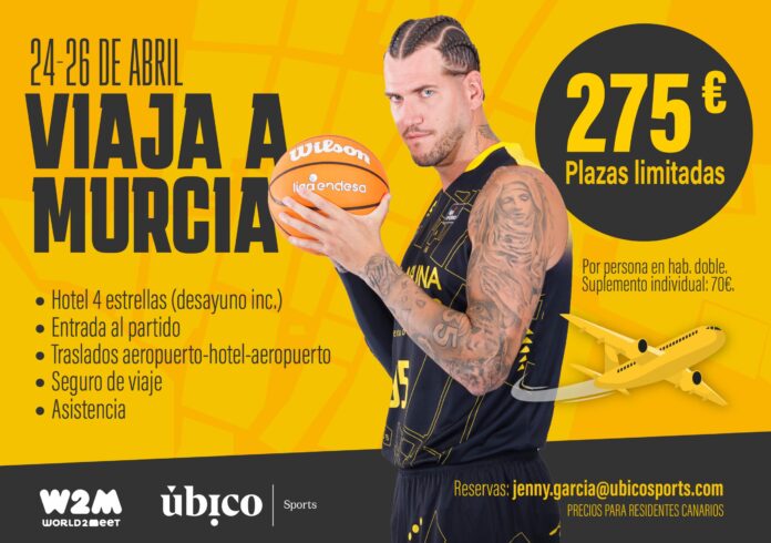La agencia de viajes Azulmarino, colaboradora oficial de La Laguna Tenerife, ha lanzado este lunes un paquete especial para acompañar al conjunto aurinegro en su visita al UCAM Murcia, correspondiente a la 28ª jornada de la Liga Endesa. El encuentro se disputará el sábado 25 de abril de 2026, a las 18:00 horas (hora canaria), en el Palacio de Deportes de Murcia.