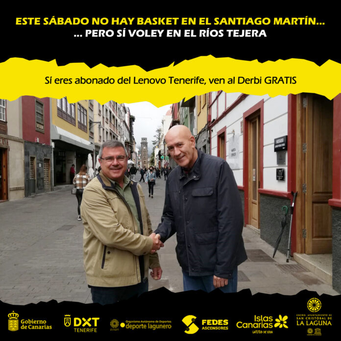 Los presidentes de Club Baloncesto Canarias, Félix Hernández, y Club Voleibol Aguere, Juan Miguel Mena Torres se reunieron la presente semana en La Laguna para llegar a un acuerdo que permitirá a los abonados del Lenovo Tenerife asistir gratis al derbi tinerfeño de la Superliga 2 Femenina este sábado 12 de marzo en el histórico pabellón Juan Ríos Tejera.