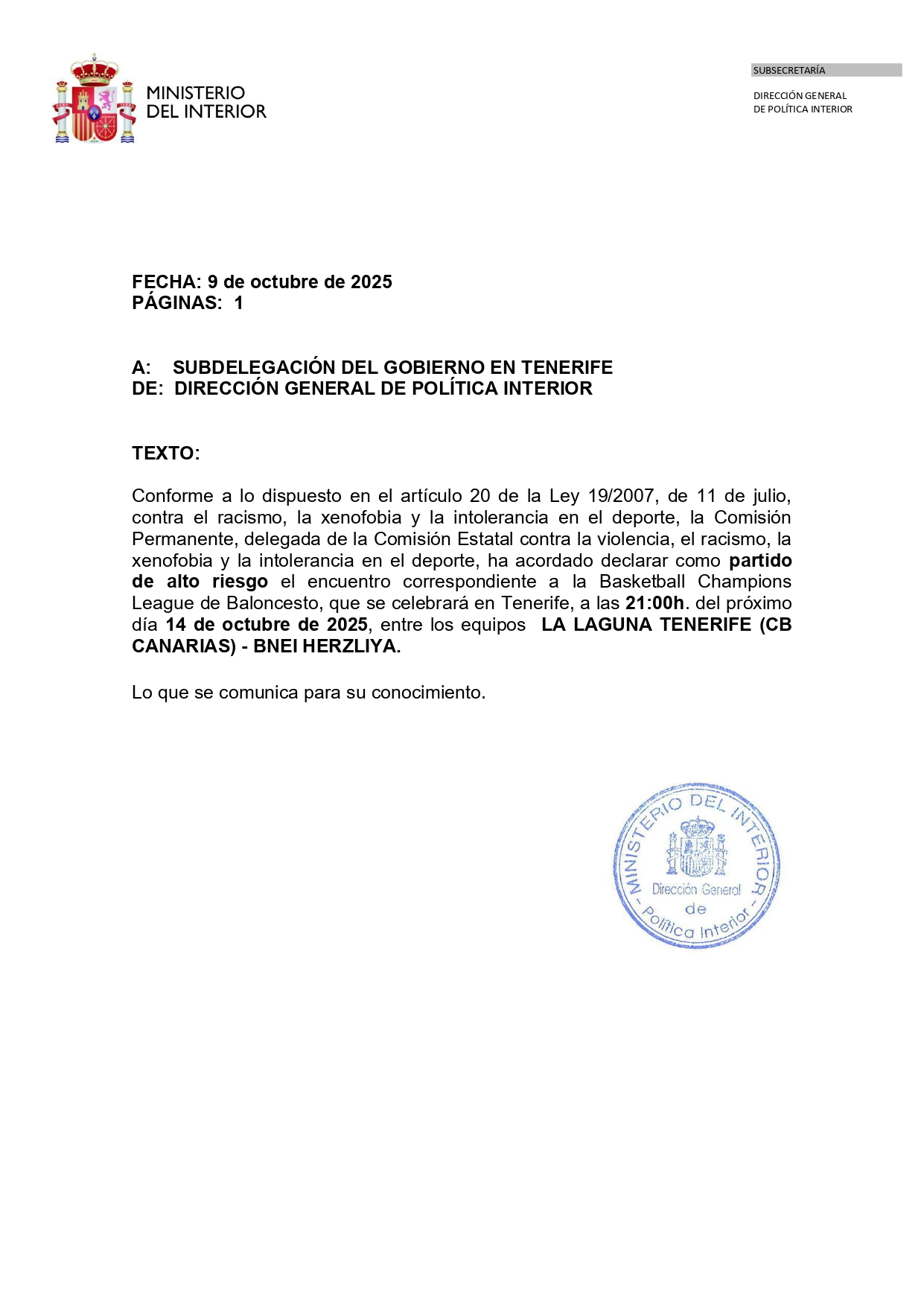 - La Comisión Estatal contra la Violencia en el Deporte ha declarado de alto riesgo el partido de la Basketball Champions League entre La Laguna Tenerife y Bnei Herzliya, previsto para el 14 de octubre en el pabellón Santiago Martín, por lo que se reforzarán las medidas de seguridad y el control policial.