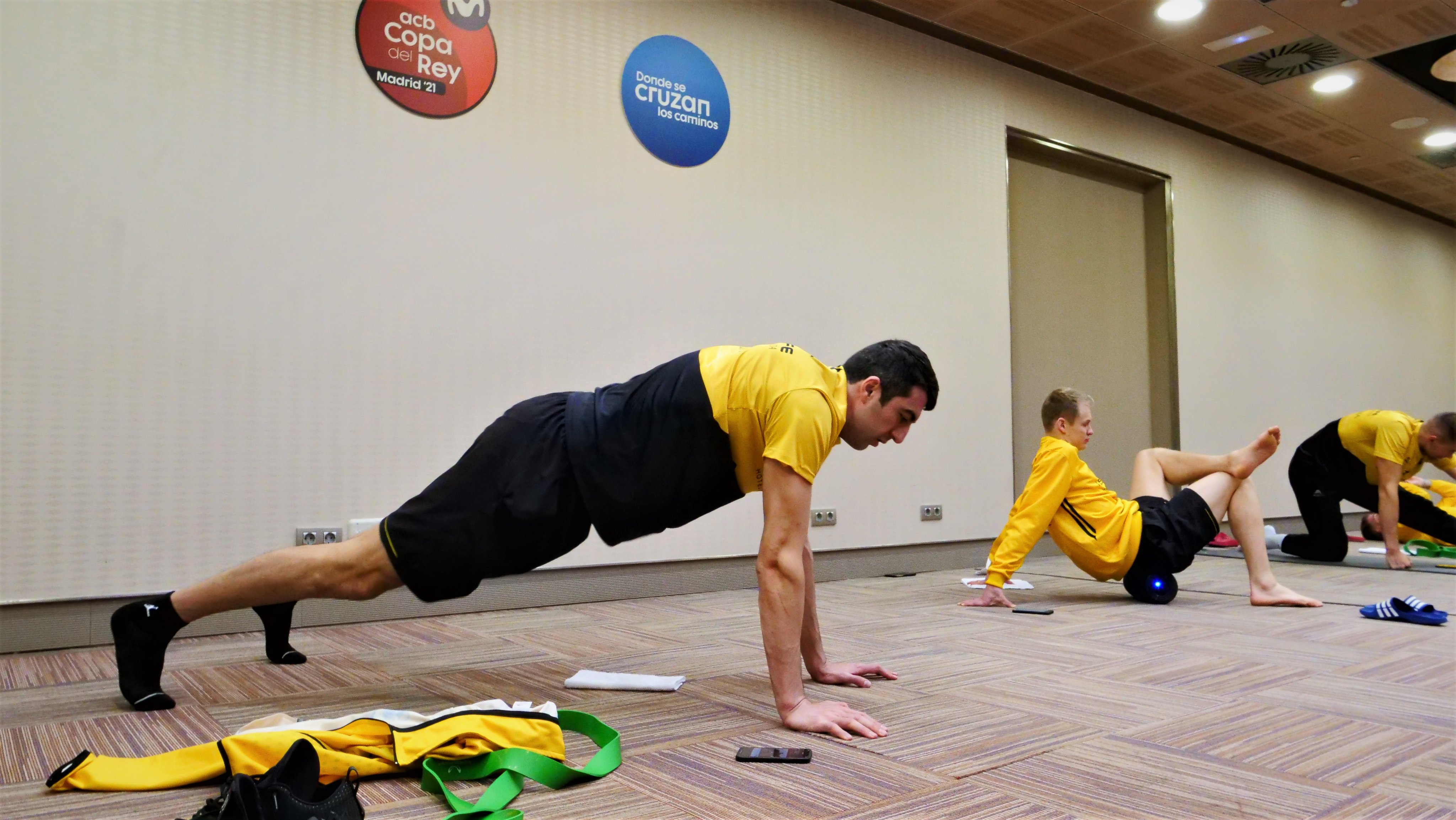 Uno de los salones principales del Hotel Meliá Castilla, cuartel general de todos los equipos así como de la organización de la Copa del Rey, fue el escenario escogido por el cuerpo técnico del Lenovo Tenerife para realizar, en la mañana de hoy, una sesión de recuperación tras la clasificación de los aurinegros para disputar las semifinales coperas, lograda anoche ante el Hereda San Pablo Burgos.