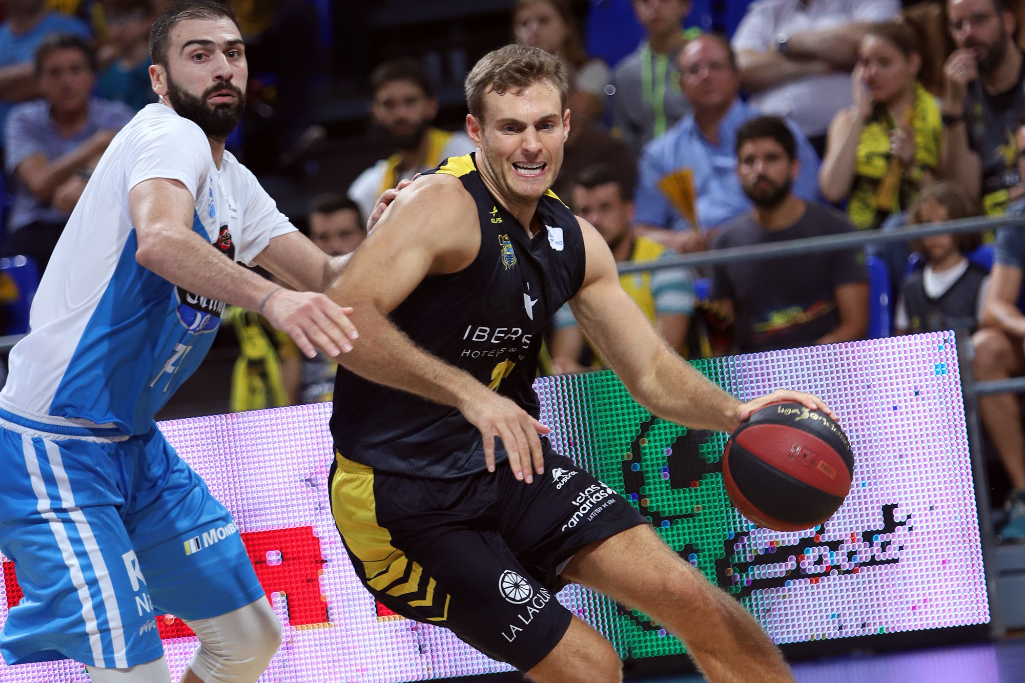 Un parcial inicial de 7-0 dejó bien a las claras la seriedad y concentración con la que saltó al remozado parqué del Santiago Martín, el equipo de La Laguna. Mientras los gallegos no veían aro, tardaron más de cuatro minutos en anotar su primera canasta, los aurinegros se marcharon en el marcador, pero los triples de Pozas, Simons y Obst permitieron a los blanquiazules ir acercándose en el electrónico, incluso adelantarse, cuando Hlinason aprovechó su envergadura para hacer daño en la pintura aurinegra. Un parcial de 0-9 para los visitantes, dio paso a la igualdad, e incluso hicieron olvidar el mal arranque de los de Santiago de Compostela (15-17).