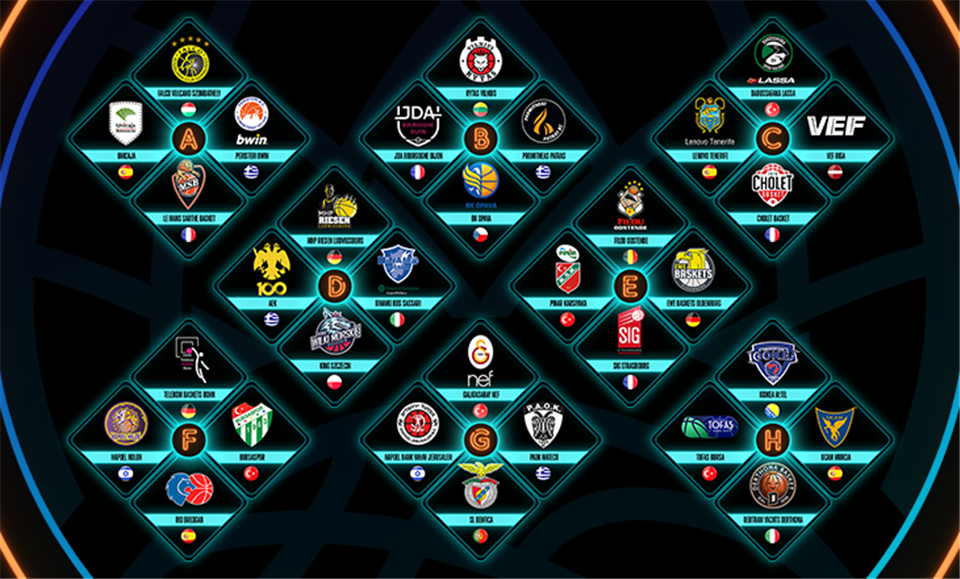 Group AFalco Vulcano Szombathely (HUN)Le Mans Sarthe Basket (FRA)Peristeri bwin (GRE)Unicaja (ESP)Group BBK Opava (CZE)JDA Bourgogne Dijon (FRA)Promitheas Patras (GRE)Rytas Vilnius (LTU)Group CDarüssafaka Lassa (TUR)Lenovo Tenerife (IC-ESP)VEF Riga (LAT)Cholet Basket (FRA)Group DAEK (GRE)Banco di Sardegna Sassari (ITA)King Szczecin (POL)MHP RIESEN Ludwigsburg (GER)Group EEWE Baskets Oldenburg (GER)Filou Oostende (BEL)Pinar Karsiyaka (TUR)SIG Strasbourg (FRA)Group FBursaspor Info Yatirim (TUR)Hapoel Holon (ISR)Rio Breogan (ESP)Telekom Baskets Bonn (GER)Group GGalatasaray Nef (TUR)Hapoel Bank Yahav Jerusalem (ISR)PAOK mateco (GRE)SL Benfica (POR)Group HBertram Derthona Tortona (ITA)Igokea m:tel (BIH)Tofas Bursa (TUR)