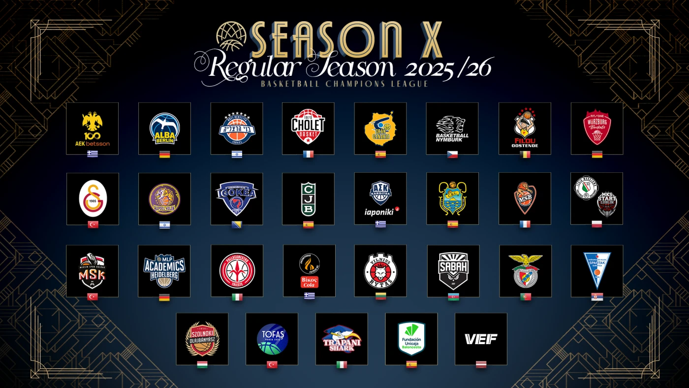 AEK Betsson BC (GRE); ALBA BERLIN (ALE); Bnei Penlink Herzliya (ISR); Cholet Basket (FRA); Dreamland Gran Canaria (IC-ESP); ERA Nymburk (CZE); Filou Oostende (BEL); FIT/One Wurzburg Baskets (ALE); Galatasaray (TUR); Hapoel Netanel Holon (ISR); Igokea m:tel (BIH); Joventut Badalona (ESP); Karditsa Iaponiki (GRE); La Laguna Tenerife (IC-ESP); Le Mans Sarthe Basket (FRA); Mersin Sports Club (TUR); MLP Academics Heidelberg (ALE); NHSZ-Szolnoki Olajbanyasz (HUN); Pallacanestro Trieste (ITA); Promitheas Patras Vikos Cola (GRE); Rytas Vilnius (LIT); Sabah BC (AZE); SL Benfica (POR); Spartak Office Shoes (SER); Tofas Bursa (TUR); Trapani Shark (ITA); Unicaja (ESP); VEF Riga (LAT); y el campeón de Polonia (Start Lublin o Legia Varsovia).