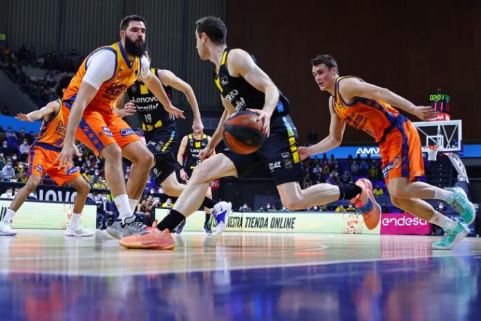 Comenzaba el choque con Valencia Basket adelantándose en el electrónico, pero un triple de Sasu Salin dio a los de Aguere los primeros puntos del partido. Marcelino Huertas, otra vez la Magia del Canarias, lideraba el juego local, aunque ambas escuadras no se mostraban especialmente acertadas de cara a la canasta contraria. Con el uruguayo Bruno Fitipaldo sobre el parqué, el quinteto local se ponía por delante gracias a un triple del propio playmaker, mientras Aaron Doornekamp sentenciaba con otro acierto desde más allá del arco de los tres puntos. Pocos segundos después, otro triple de un inspiradísimo Doornekamp colocaba a los de amarillo y negro con una ventaja de siete puntos (17-10) gracias a la transformación de otro lanzamiento triple. Quisieron reaccionar los valencianos y lo lograron a base de meter balones en la pintura, que resolvió de forma efectiva el pívot cubano Jasiel Rivero, colocando el 21-19 al finalizar el primer acto.