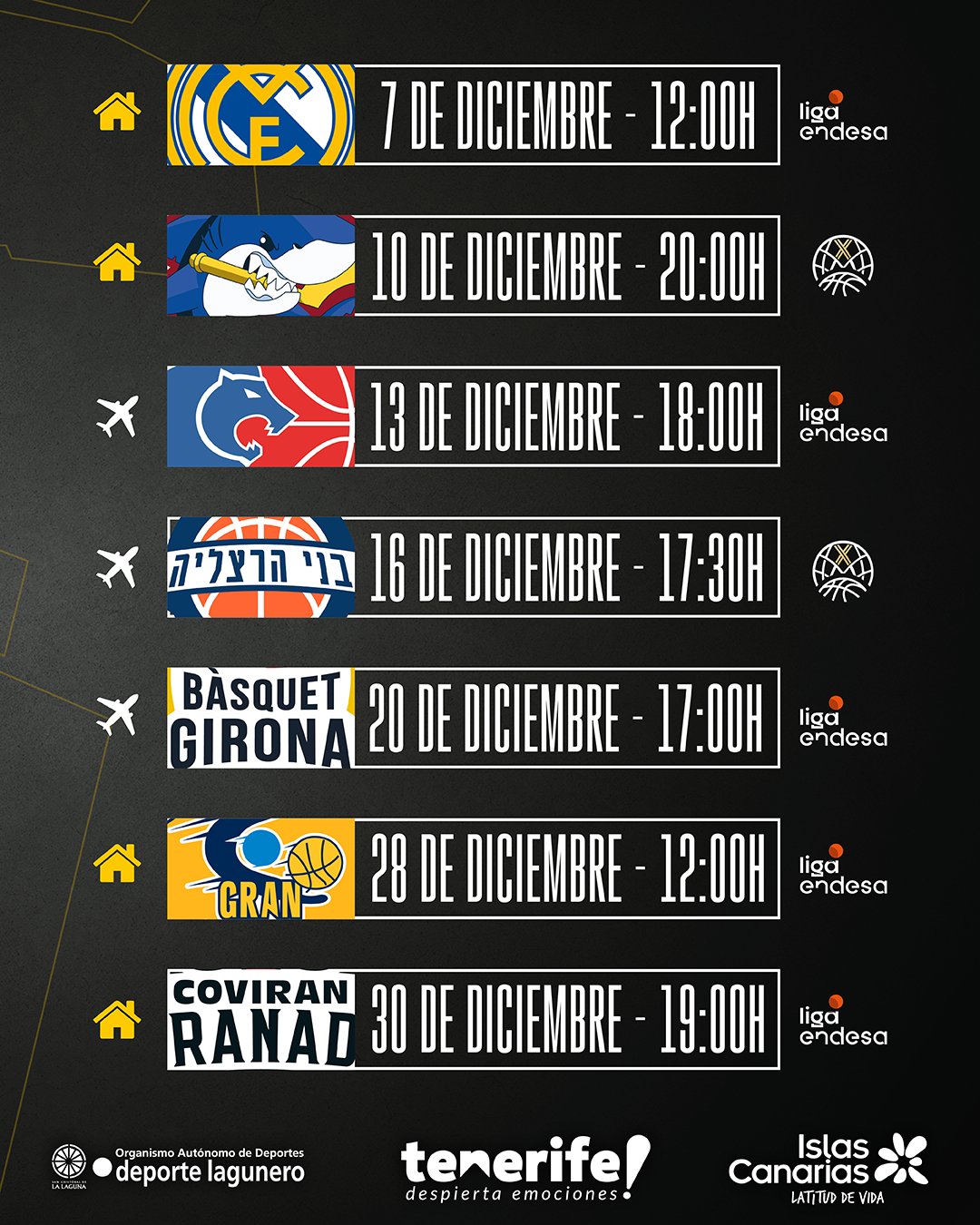 El domingo 7 de diciembre, a las 12:00 horas, el Santiago Martín acoge un duelo de altura: La Laguna Tenerife vs Real Madrid. A final de mes, el sábado 28 de diciembre está previsto otro choque relevante: La Laguna Tenerife vs Dreamland Gran Canaria, en el Santiago Martín, un derbi canario que siempre levanta expectación.