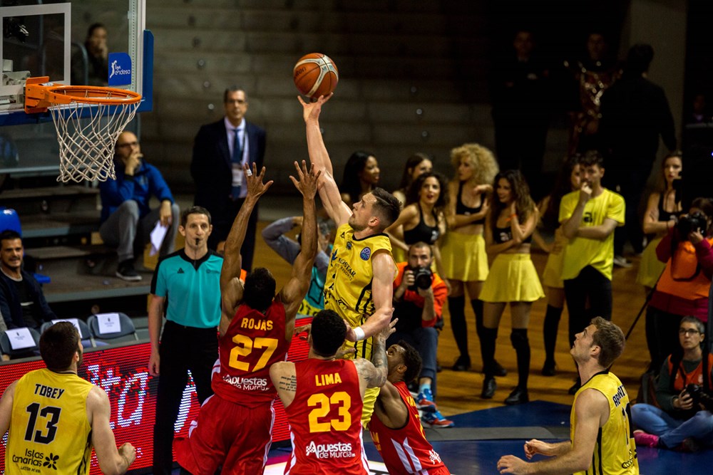 El envite final comenzó con el Canarias buscando el juego interior del estadounidense Mike Tobey, mientras Murcia prefería tirar desde el perímetro por medio de Brad Oleson, dos triples consecutivos para el jugador rojillo (4-6, minuto 2). La contestación aurinegra vino de las manos de otro estadounidense, Davin White, que con cinco puntos consecutivos situó a los tinerfeños por delante en el electrónico (9-7, minuto 4).