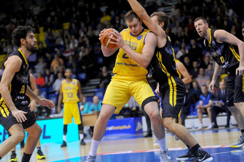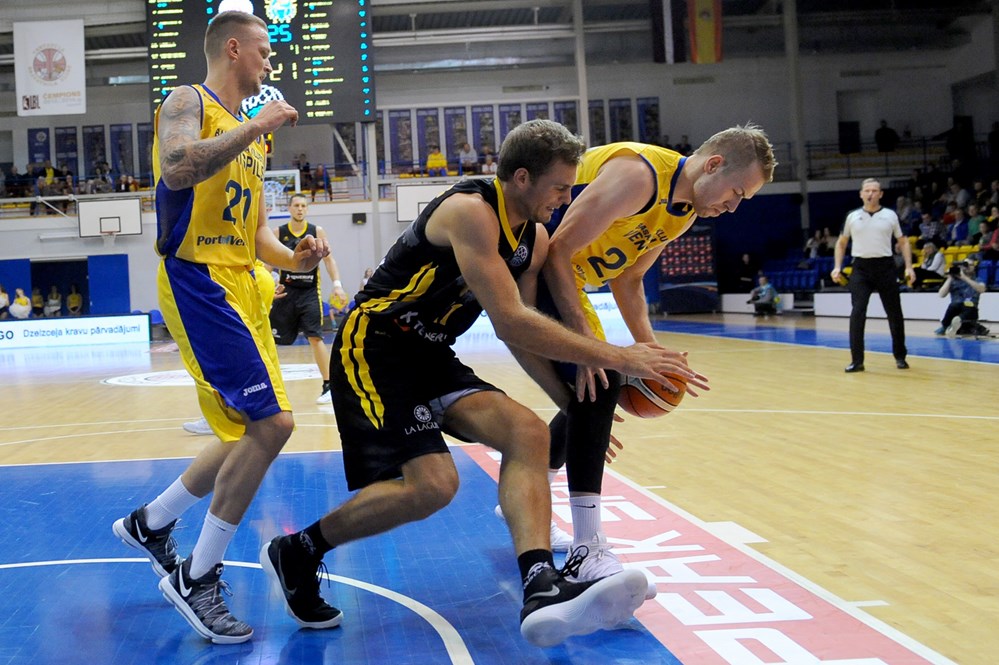Mike Tobey, otra vez Tobey, anotó la primera canasta para los aurinegros en una primera parte donde el norteamericano volvió a dejar grandes muestras de saber jugar a esto del baloncesto, certificando su calidad. Los laguneros se adelantaron en el minuto tres gracias a una canasta del polaco Ponitka para poner un pobre 3-4 en el marcador del pequeño pabellón letón. El intercambio de canastas era la nota habitual en unos primeros minutos donde los canaristas sólo estaban acertados en la pintura mientras los letones las enchufaban desde fuera (7-10, minuto 5).