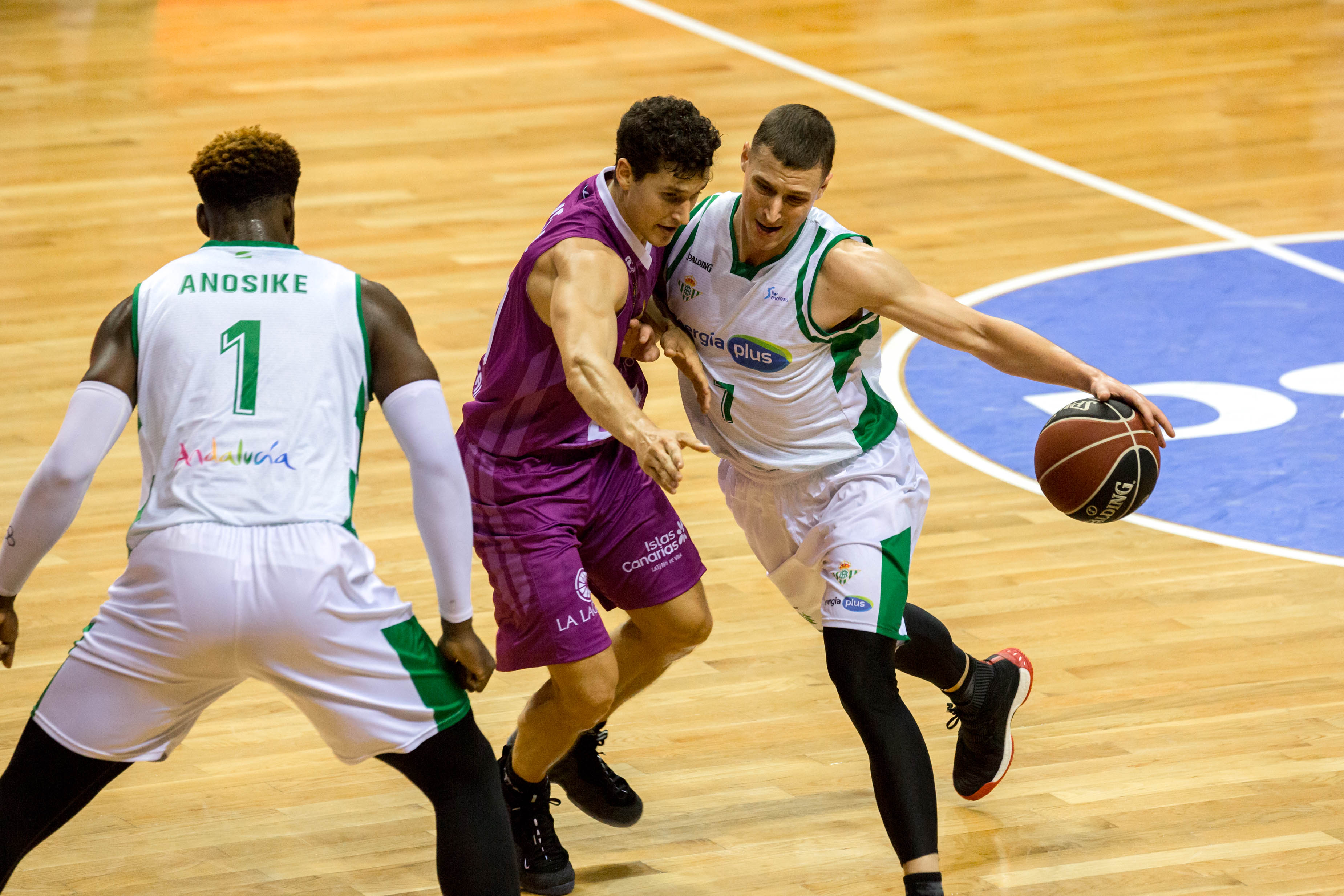 El tercer triple de San Miguel destrozó la defensa zonal del Betis (44-29, minuto 18), devuelto por Joseph Franch (44-32) para entrar en el último minuto. El ex madridista Draper, también desde el exterior, anotó para los suyos dejando el electrónico en 46-35 para los de Aguere.
