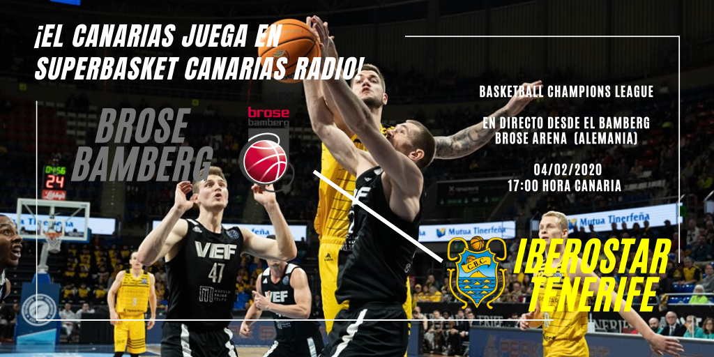 El Canarias juega en SuperBasket Canarias Radio. Transmisión en directo, a partir de las 17.00 (hora canaria) del encuentro correspondiente a la última jornada de la fase de grupos de la Basketball Champions League entre Brose Bamberg e Iberostar Tenerife.