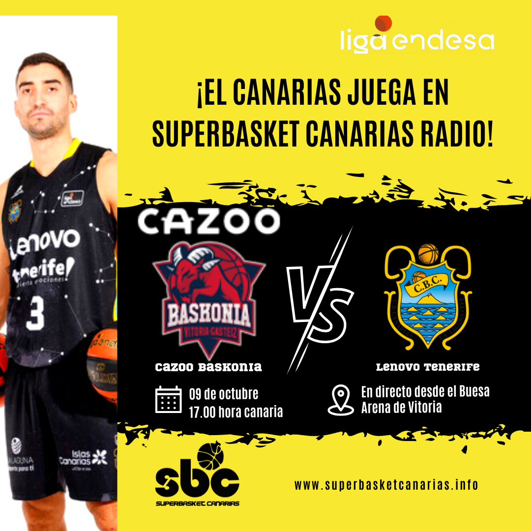 El Canarias juega en SuperBasket Canarias Radio. Transmisión en directo, a partir de las 17.00 hora canaria, del partido entre Cazoo Baskonia y Lenovo Tenerife, correspondiente a la tercera jornada de la Liga Endesa 2022-23. Desde el Fernando Buesa Arena de Vitoria, en la voz de José Luis Hernández y junto a todo el equipo de SuperBasket Canarias (@superbasket7).