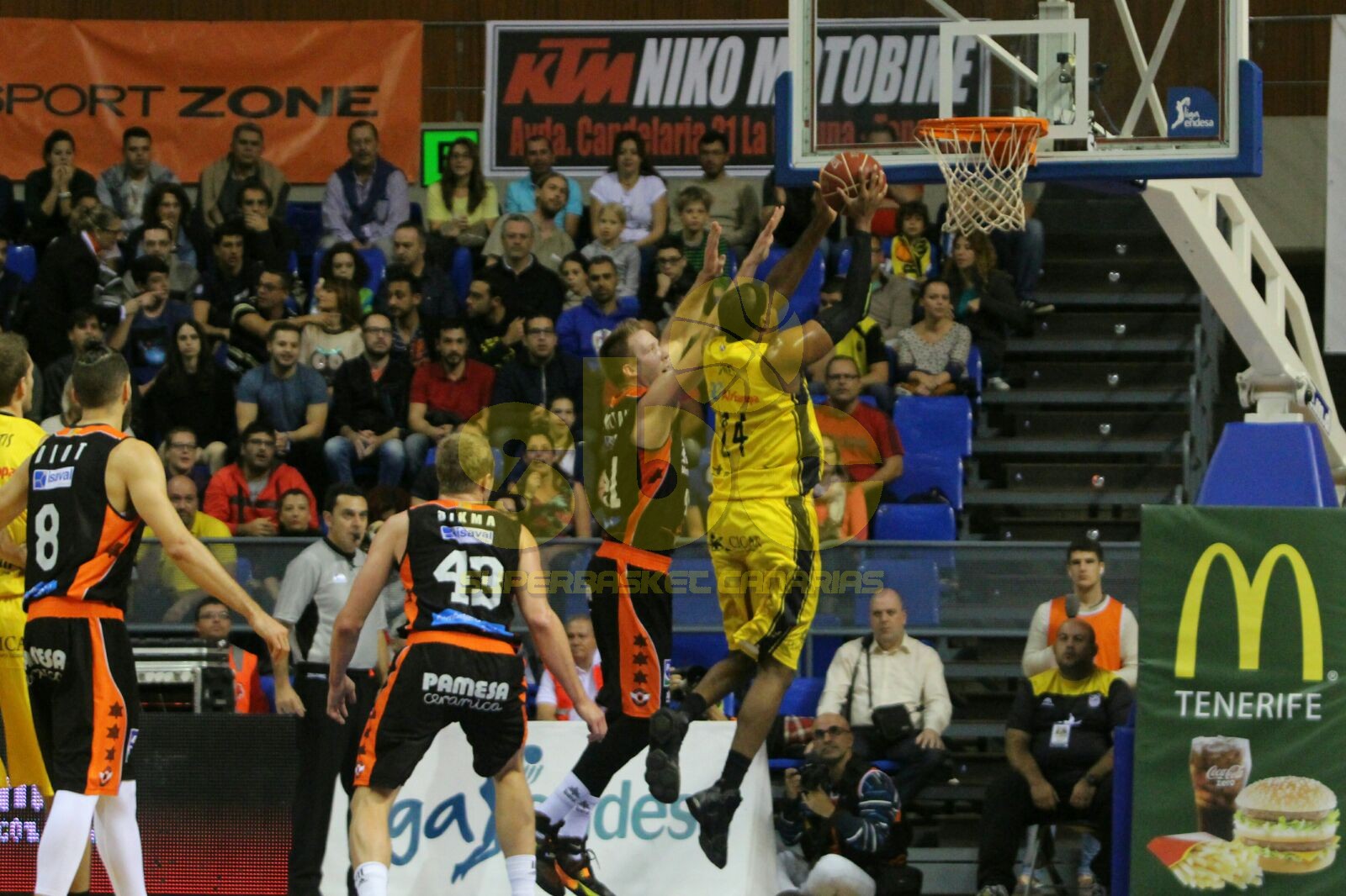 El primer cuarto estuvo marcado por la intensidad con la que el Murcia comenzó defendiendo. No le importaba estar desacertado en ataque porque atrás consiguió frenar a los jugadores más peligrosos y con más talento del conjunto tinerfeño. Los de Katsikaris fueron los primeros en golpear, si bien las diferencias no eran muy importantes. Pero en el ecuador del primer cuarto el equipo local se hizo con el rebote, se mostró muy efectivo desde la línea de tres puntos y se fue en el marcador por encima de los diez puntos. Los locales defendieron bien el perímetro de su oponente y eso le permitió irse por 27-16, una renta que pudo ser mayor si Hanley no llega a acertar desde su pista. Los 4 de 4 en triples y los 12 rebotes por solo 4 de su rival, la clave.