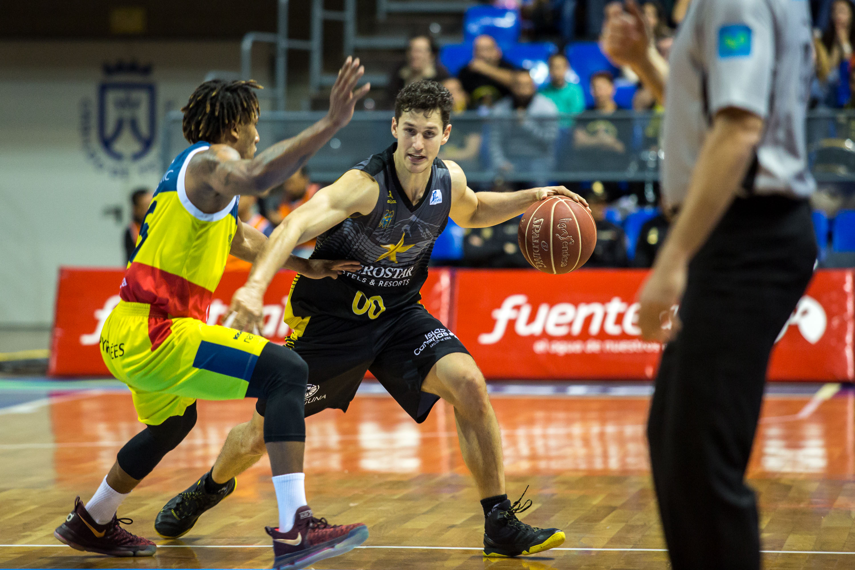 Aaron «ametralladora» Doornekamp y Will Hanley formaron en el cinco inicial aurinegro, siendo ellos los autores de los primeros cinco puntos de los laguneros, aunque el ex Zaragoza Shermadini y Walker daban la primera ventaja a los del País de los Pirineos (5-6, 2′). El Canarias se mostraba afortunado en ataque y todos anotaron salvo el base San Miguel. Dos triples de Grigonis establecieron el 15-10 en el electrónico a falta de 6 minutos para el final del primer cuarto. El ritmo era muy alto, tal y como le gusta jugar a Andorra, sin faltas hasta que quedaron 4 minutos y 20 segundos. El rebote ofensivo dio hasta cuatro oportunidades de segundos tiros a los laguneros, sin perdonar «ametralladora» Doornekamp desde más allá de la línea de tres y, tras un robo de balón, San Miguel dio la primera renta notoria a los suyos (20-12, 6′).