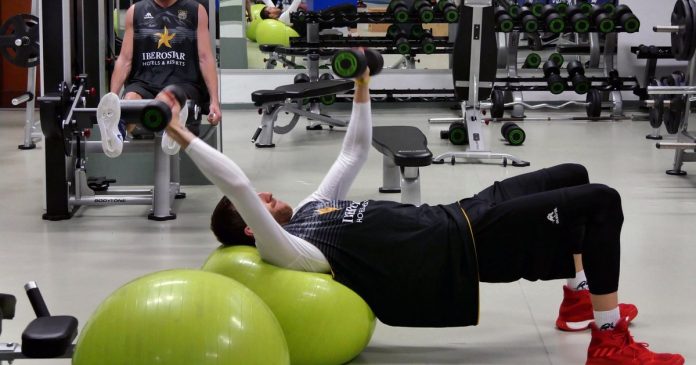 Los jugadores aurinegros compaginaron el gimnasio con el parqué durante hora y media y esta tarde han vuelto a hacer lo propio, trabajando en los mismos escenarios.