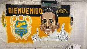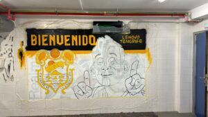 - El grafitero oficial de conjunto morado Jesús Castro ‘Sete’, realiza un magnífico mural a modo de recibimiento al Canarias.