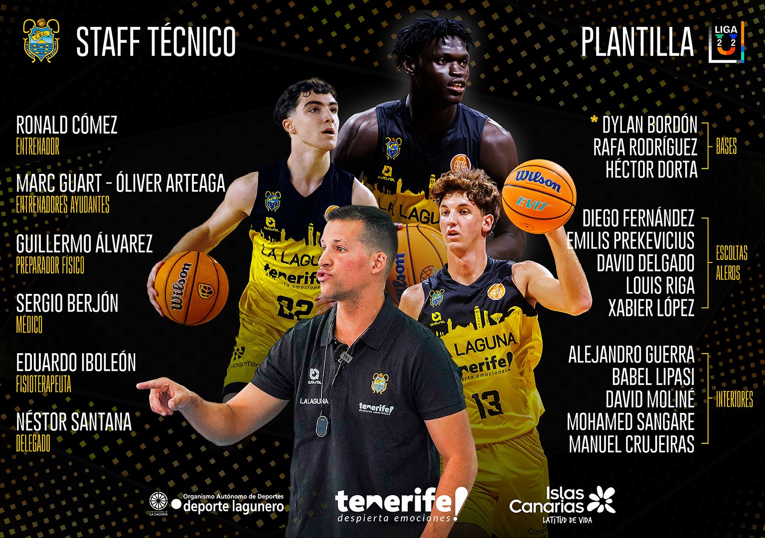En el perímetro estarán Diego Fernández; el escolta lituano Emilis Prekevicius, nacido en 2008 y procedente del Barça; David Delgado; Louis Riga; y el alero tinerfeño Xabier López (2004), llegado desde el Benicarló de Segunda FEB. El juego interior contará con Alejandro Guerra y Babel Lipasi en la posición de ala-pívot, junto a David Moliné, Mohamed Sangare y Manuel Crujeiras, pívot de 2005 que el curso pasado militó en la Northwest University con los Eagles.
