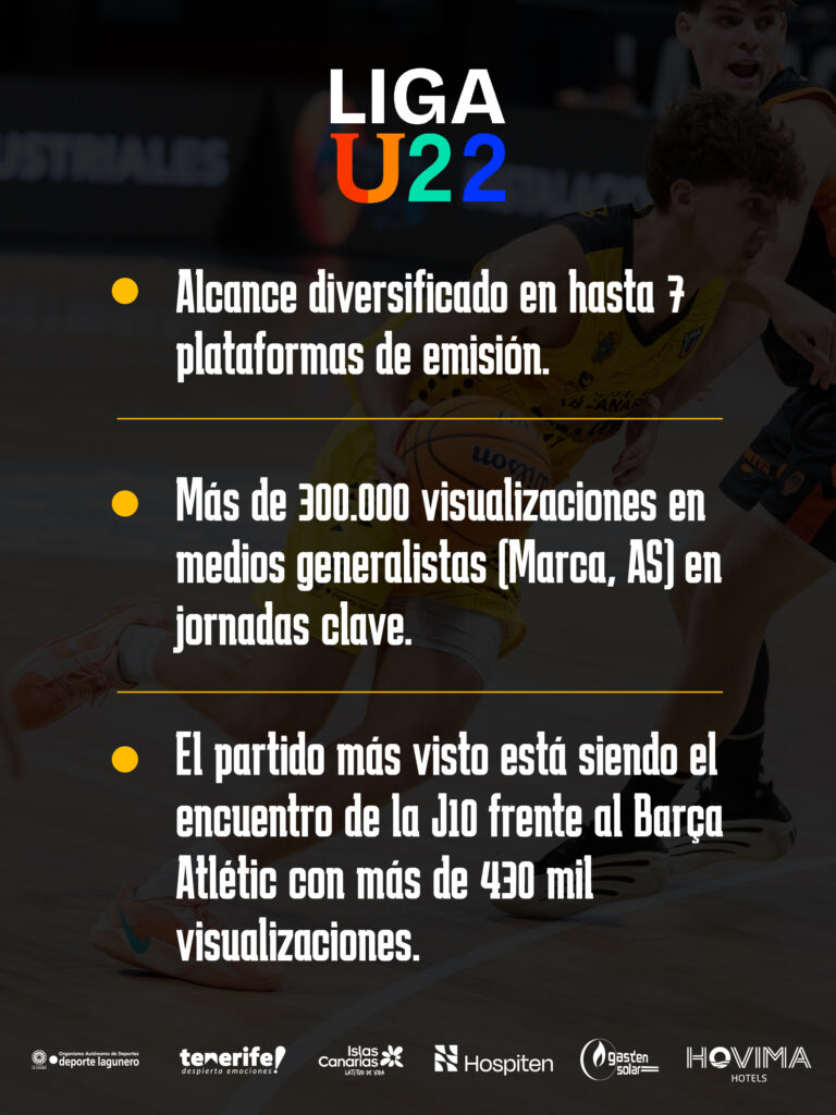 La Liga U, dirigida a la categoría U22 y organizada por la Asociación de Clubes de Baloncesto (ACB), Federación Española de Baloncesto (FEB) y el Consejo Superior de Deportes (CSD), ha tenido una irrupción destacada desde su puesta en marcha. Los encuentros del conjunto amarillo y negro han alcanzado audiencia a través de hasta siete plataformas diferentes, ampliando de forma considerable su alcance. Además, más de 300.000 de estas visualizaciones se han registrado en medios de comunicación generalistas, lo que evidencia una presencia significativa fuera de los canales estrictamente especializados.
