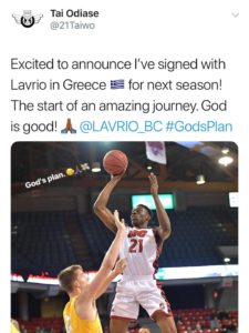 La Laguna (Tenerife), 27 de junio de 2018 – El Lavrio, equipo de la Serie A-1 de la Liga griega, ha anunciado en la tarde noche de ayer la contratación del interior Tai Odiase, que llega al conjunto heleno procedente del Canarias de la Liga Endesa.
