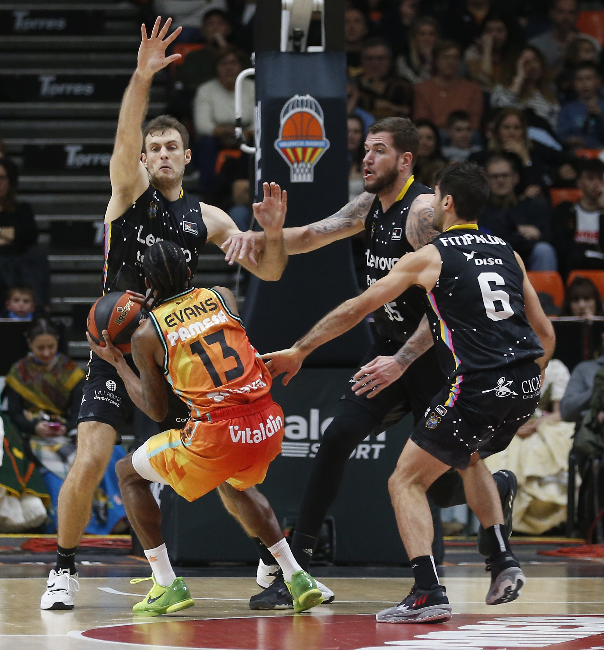 Herido en su orgullo tras su pésima imagen en la cancha del Baskonia en la Euroliga, Valencia Basket arrancó más intenso que un Canarias que llegaba descansado tras dos semanas sin jugar. Apenas dos minutos tardó Txus Vidorreta en pedir un tiempo muerto para tratar de despertar a su equipo y treinta segundos más en meter a Marcelinho Huertas en la pista. Fue la conexión entre el base y Gio Shermadini la que conectó a los visitantes e igualó el choque. El agujero que el brasileño le creó por el centro llevó al Valencia a tratar de proteger esa zona a costa de desguarnecer las esquinas. Cuando se asentó y las volvió a proteger apareció Jaime Fernández para retomar esa senda. Las dudas de los locales y de su público se hicieron patentes y el Lenovo Tenerife abrió brecha anotando con facilidad con el canario Fran Guerra como inesperado generador (25-36, minuto14).