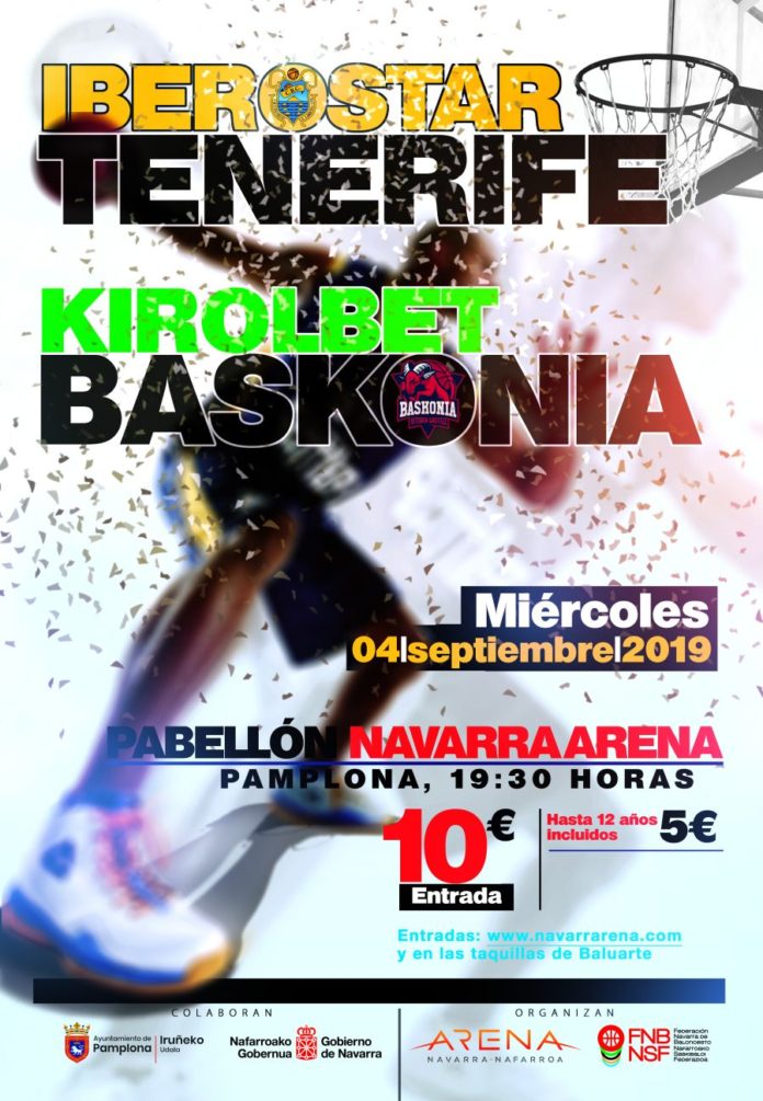 La Federación Navarra de Baloncesto y el Navarra Arena, con la colaboración del Gobierno de Navarra y el Ayuntamiento de Pamplona, organizan el partido Kirolbet Baskonia-Iberostar Tenerife el próximo miércoles 4 de septiembre (18.30 hora canaria, SuperBasket Canarias Radio en directo), en el pabellón Navarra Arena y ya han presentado el cartel del evento.