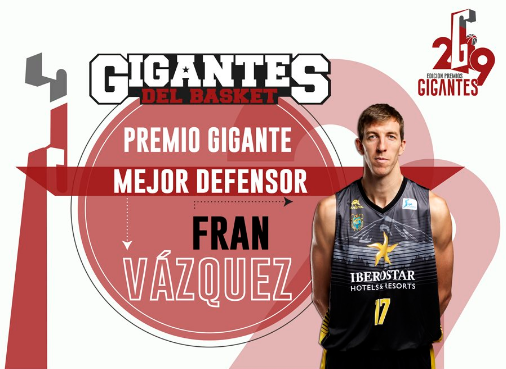 El pívot canarista Fran Vázquez ha sido galardonado con el premio Gigante al mejor defensor, reconocimiento otorgado por la prestigiosa revista Gigantes del Basket que este lunes ha celebrado su XXIX Gala de los Premios Gigantes del Basket en la sede de Endesa (Madrid).