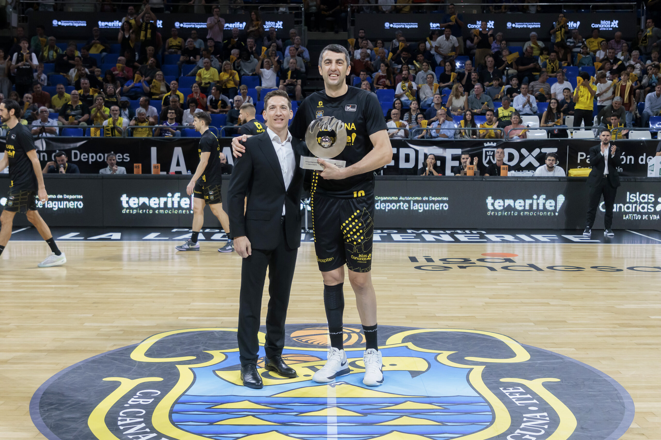 Ayer, antes del inicio del partido ante San Pablo Burgos, Gio Shermadini vivió un momento especial que emocionó tanto a los aficionados en el pabellón Santiago Martín como a los televidentes ante las pantallas. El pívot georgiano de La Laguna Tenerife recibió de manos de Nico Richotti el trofeo que lo acredita como Jugador Más Valioso (MVP) del mes de octubre, en reconocimiento a su destacado rendimiento durante las primeras jornadas de la presente temporada.