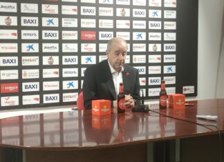 El entrenador canarista compareció en la sala de prensa del Nou Congost para analizar el encuentro realizado por sus jugadores.