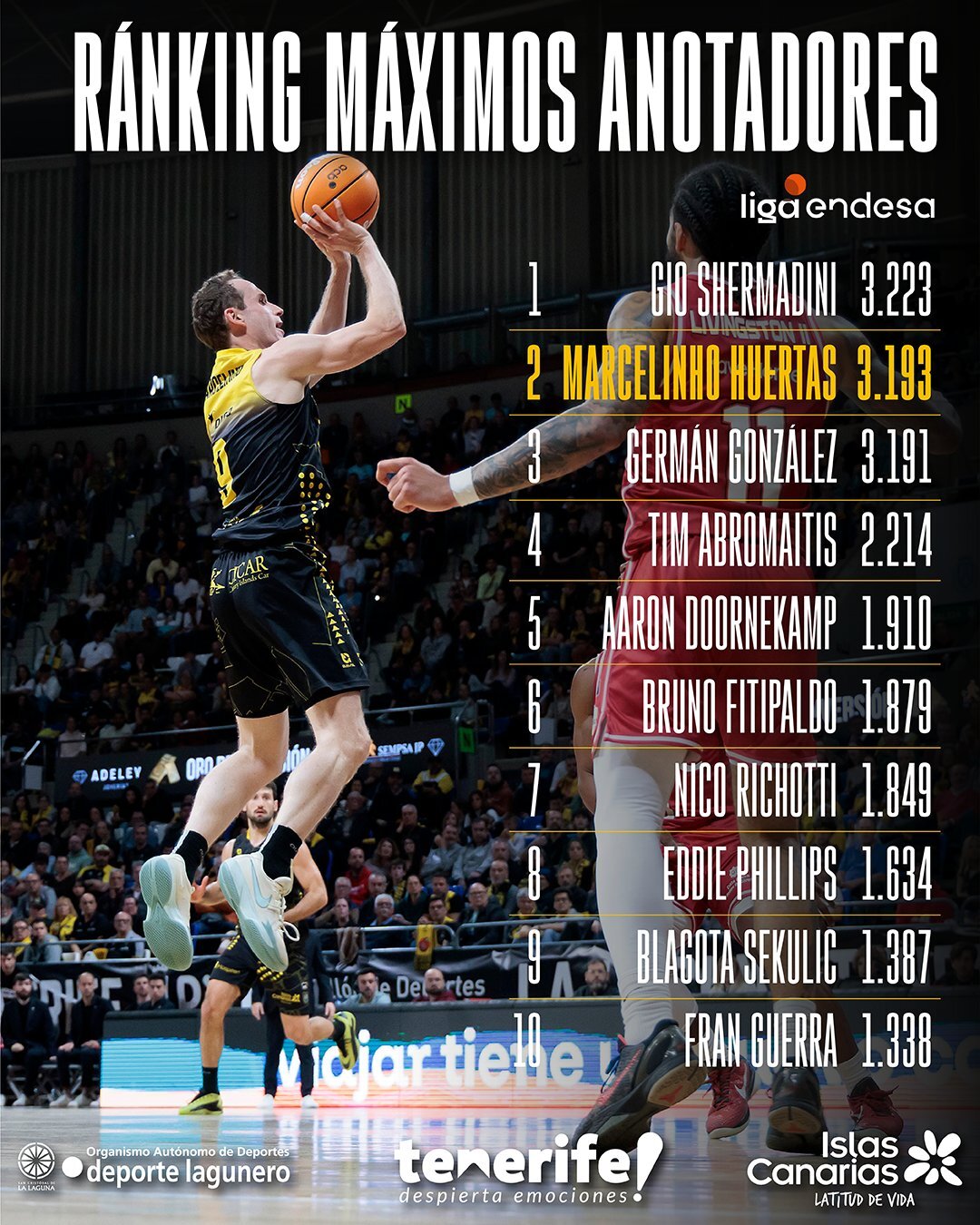 ¡Hito tras hito! Marcelinho Huertas continúa ampliando su legado en el baloncesto español tras lograr una nueva marca histórica en la Liga ACB. El base brasileño se ha convertido en el segundo máximo anotador aurinegro de la competición, alcanzando un total de 3.193 puntos por detrás de su compañeros de equipo Gio Shermadini, que comanda la clasificación con 3.223 puntos.