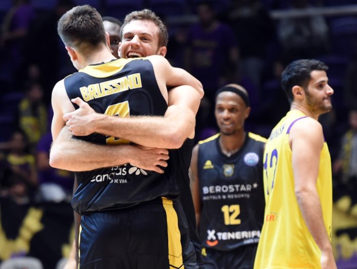 Brussino tomó el papel protagonista (59-62), anotando los últimos siete puntos para los aurinegros. El partido se mostraba intenso e igualado (64-64), a poco más de 7 minutos para el final. Huber y Brussino lideraban el concierto anotador de los suyos (69-68, minuto 34), mientras Tim Abromaitis y Pnini, desde más allá de la línea de tres puntos, siguieron anotando (72-71, y 72-73, minuto 35). Defendía muy bien el Canarias en esos instantes, y dos triples de Nico Brussino llevaron la alegría hasta el banquillo tinerfeño (74-79, minuto 36), lo que motivó la solicitud de un tiempo muerto por el técnico local.