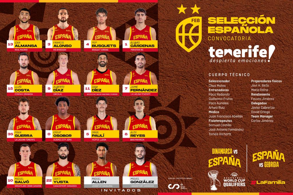 La lista de Mateo, anunciada en el Recinto Ferial de Tenerife, se ha visto condicionada por la no inclusión de baloncestistas que participan en la Euroliga, NBA o NCAA, salvo la excepción de Izan Almansa, debido a su escaso protagonismo en el Real Madrid. Estas limitaciones han permitido la incorporación de varias novedades, entre ellas el propio Almansa, el ex aurinegro Lluís Costa, Álex Reyes, Francis Alonso y Pep Busquets, todos destacados en la Liga Endesa.