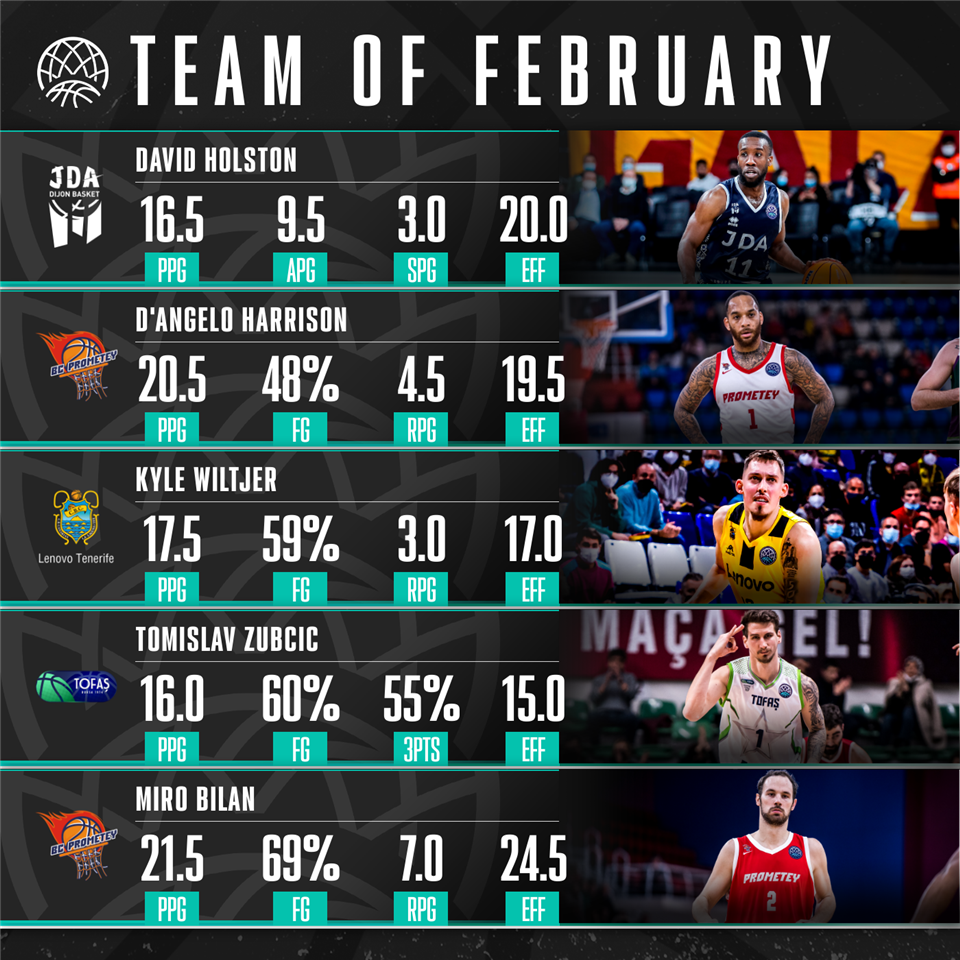 No ha habido mucha acción en la Basketball Champions League en febrero, pero aun así fuimos testigos de algunas actuaciones individuales impresionantes. La pareja de estrellas del Prometey lidera el Equipo del Mes en febrero y se asociaron con jugadores de JDA Dijon, Lenovo Tenerife y Tofas Bursa.