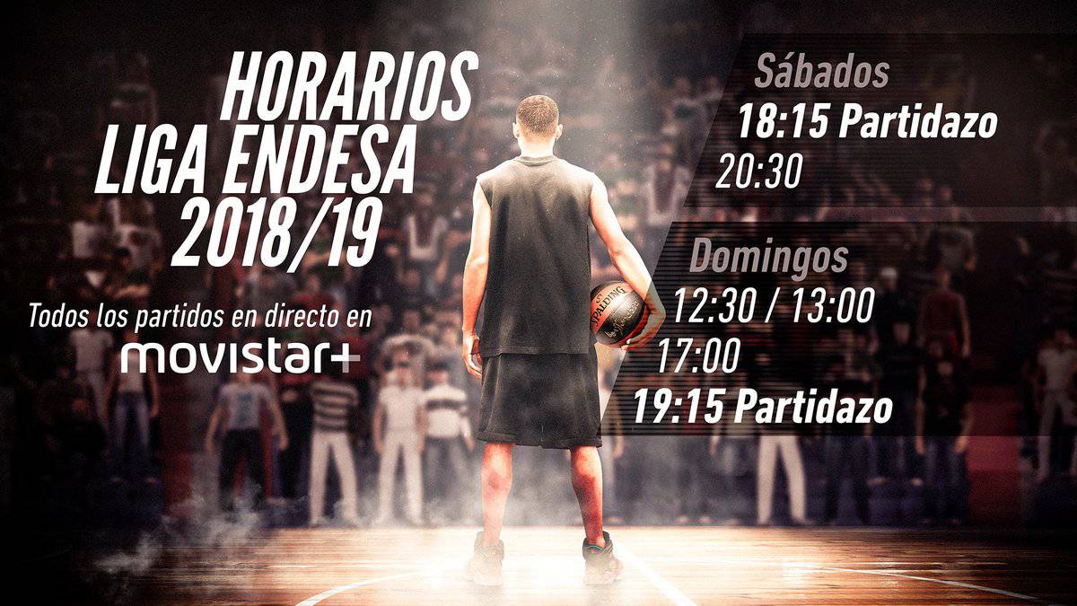 • La Liga ACB reorganiza junto a Movistar+ sus horarios para la temporada 2018-19, estableciendo cinco franjas de partidos cada fin de semana: los sábados se jugará a las 18:15 y a las 20:30, y los domingos a las 12:30/13:00, a las 17:00 y el Partidazo a las 19:15h.