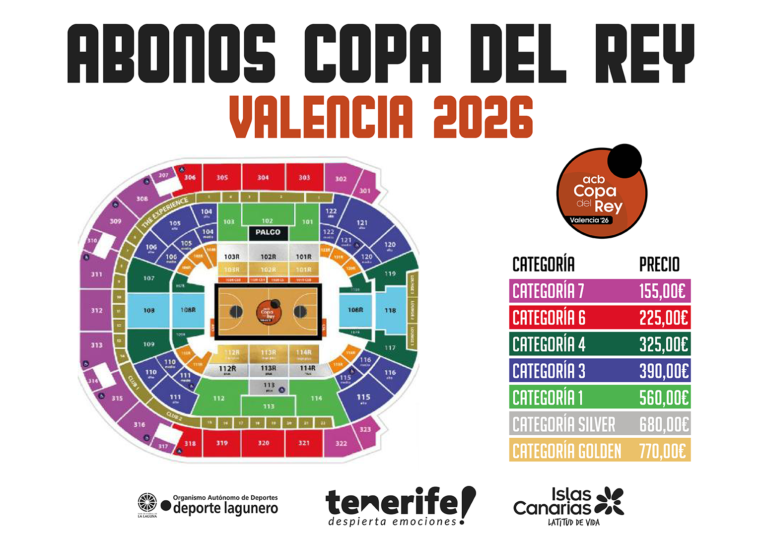 Los abonos disponibles para la venta, cedidos por la ACB, incluyen el acceso a la totalidad del evento. Las categorías y precios fijados son los siguientes: