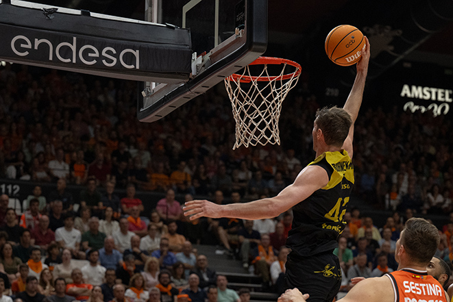 Y tras la pausa, el momento más bello del Canarias. Dos triples más de Doornekamp, que terminaría con 17 puntos y cinco aciertos desde la línea de 6,75 metros, y el equipo, con una defensa más compacta, se acercó a tres puntos (53-50). Valencia miraba el banquillo. Montero se activaba. Jones, tocado en el muslo, se marchaba. Había partido. Había vida. Pero… el último cuarto fue un suspiro cortado: apenas seis puntos anotados por los tinerfeños en diez minutos. Jean Montero despegó como un relámpago, Puerto sumó un triple que fue sentencia anticipada, y las opciones isleñas se diluyeron sin encontrar el aro ni el ritmo. La Fonteta rugía. El Canarias se quedaba quieto.