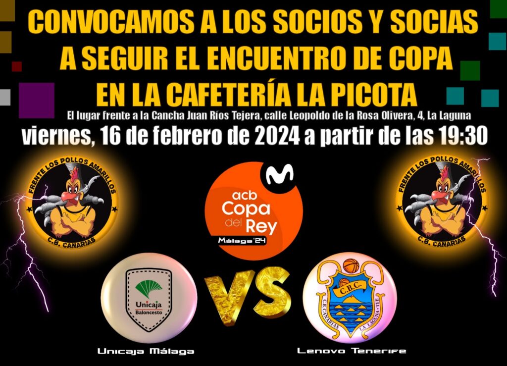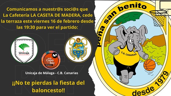 Cualquier cita marcada en rojo para el Canarias lo es también para sus aficionados. Por ello, las peñas del club lagunero, Peña San Benito y Peña Frente Los Pollos Amarillos Amarillos ha convocado a sus socios y socias a seguir el encuentro de este viernes (Palacio de Deportes José María Martín Carpena, 20.00 hora canaria, SuperBasket Canarias Radio en directo desde Málaga) en la Cafetería La Caseta de Madera y la cafetería La Picota, ambas en el lagunero barrio de San Benito, para animar al conjunto lagunero.