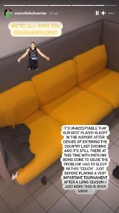 Esta información se ha conocido a través de una publicación del también canarista Marcelinho Huertas, que ha publicado en su Instagram una foto del sofá en el que ha pasado la noche Shermadini. En la foto, el base brasileño ha escrito un texto en el que se indica que “es inaceptable que le hayan negado la entrada al mejor jugador del equipo y que el tiempo siga pasando sin que se solucione el problema”.