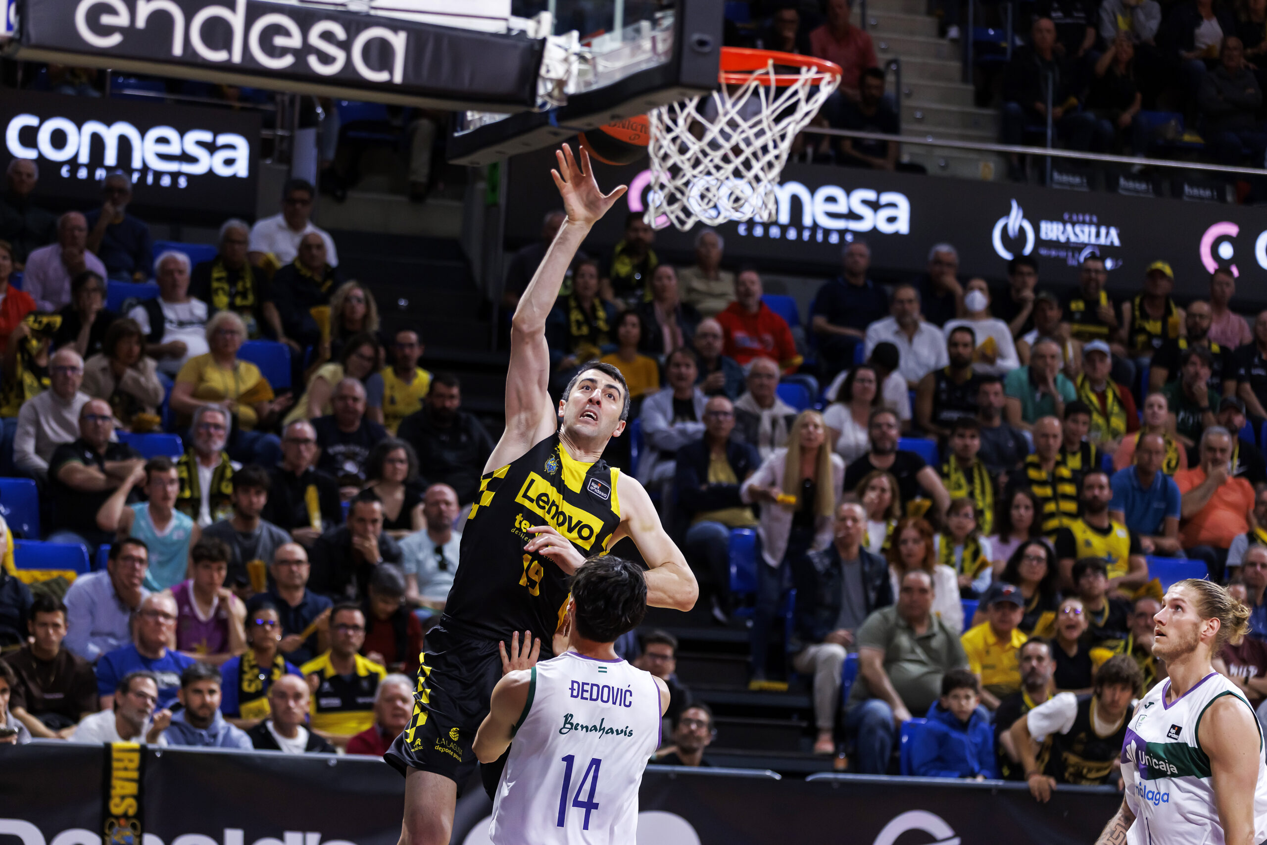 El inicio del tercer cuarto fue clave y con nombre propio: Gio Shermadini. Tres canastas suyas y una asistencia sobre Abromaitis tras robar el mismo el balón supuso que el Lenovo Tenerife volviera a controlar el partido (74-68). Ya los de amarillo y negro no abandonarían el control del marcador, aunque el Unicaja, por momentos se lo puso muy complicado. Perry puso el nerviosismo de nuevo en la grada (80-77, min.36), pero Huertas, con una excelente dirección y anotación mantuvo a su equipo por delante.