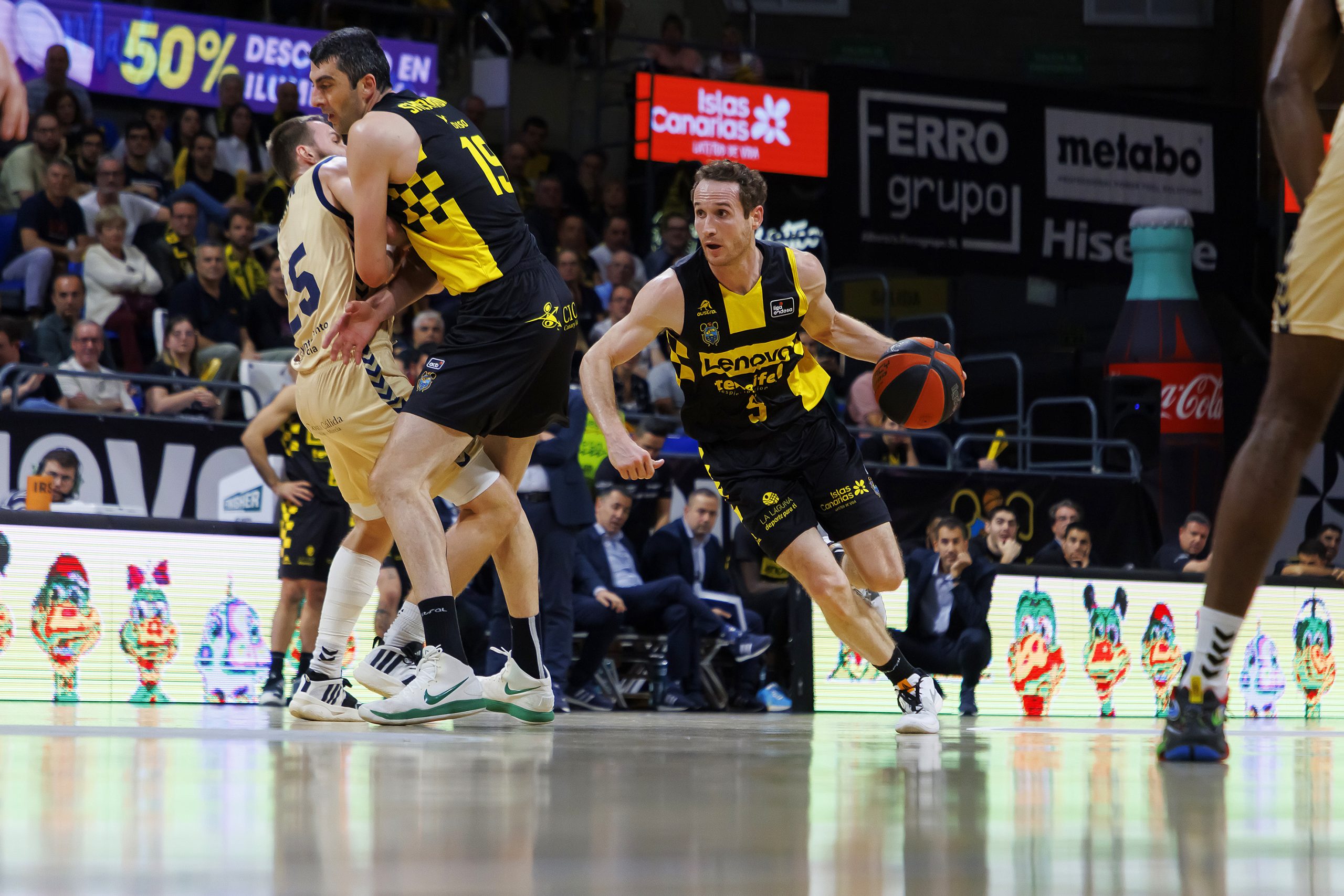 Partido muy igualado en La Laguna, con muchas alternativas en el electrónico, pero con un equipo tinerfeño que sabe jugar esos últimos minutos como la ha demostrado en los últimos partidos, aunque hoy UCAM Murcia lo llevó al límite y a punto estuvo de llevarse el triunfo. El inicio del último cuarto resultó decisivo para que el quinteto amarillo y negro, que no negro y amarillo, se llevara el triunfo. Con un 52-53 concluyó el tercer cuarto pero una canasta de Gio Shermadini y un triple del finés Sasu Salin, supuso el inicio del dominio isleño. Y es que el parcial del equipo de Aguere se fue hasta un 10-0 (62-53) y el partido ya estaba encarrilado para los locales, aunque se les complicó en los últimos instantes.