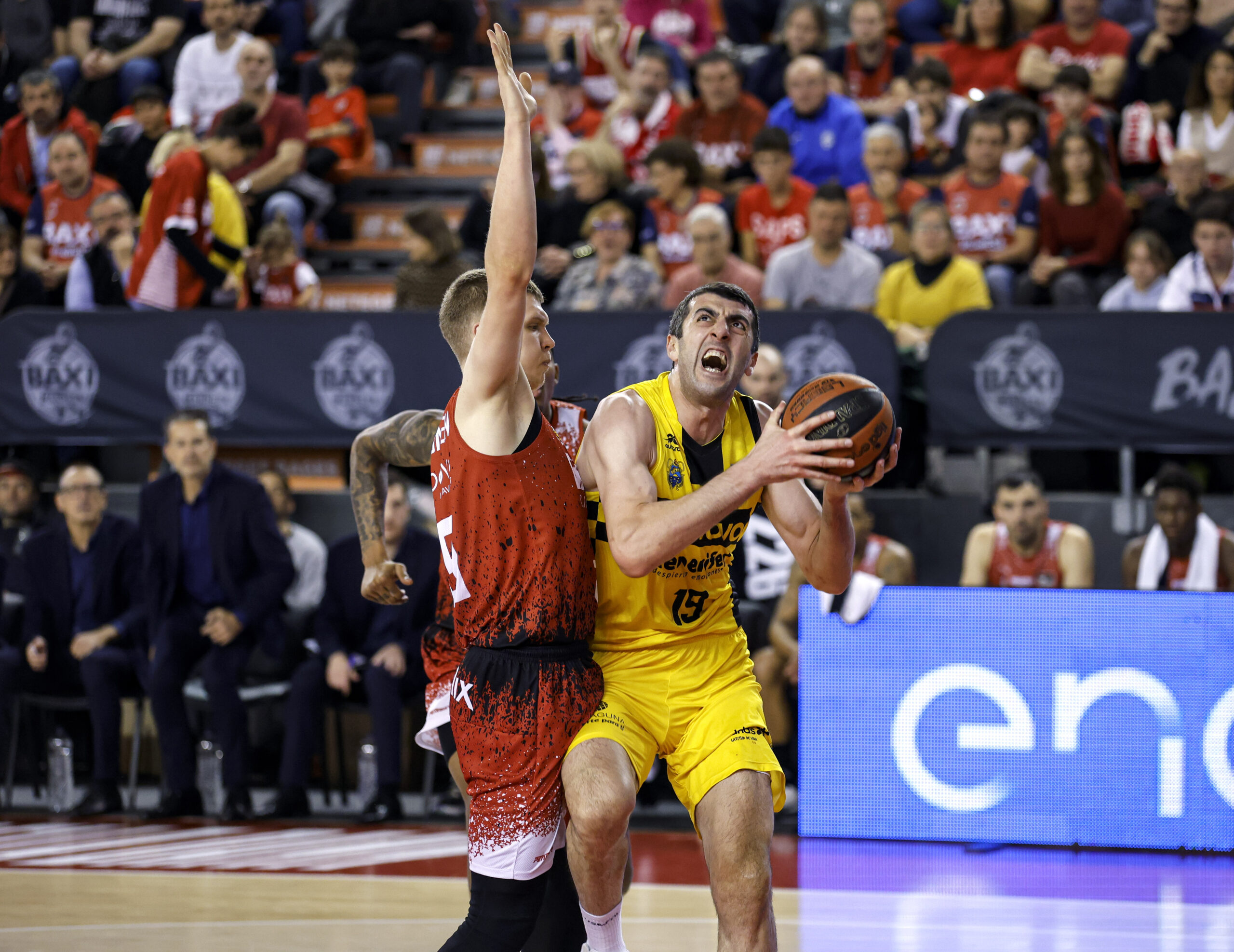 El guión del segundo periodo no varió demasiado, con un Lenovo Tenerife más acertado en ataque y con un Baxi Manresa que continuó con problemas para atacar el aro defendido por los tinerfeños. El canadiense Aaron Doornekamp, con un triple esquinado, puso la primera brecha en el marcador, pero un parcial de 6-0 para los locales volvió a igualarlo todo (19-21, minuto 16). Fue entonces cuando el Canarias puso la directa con cinco puntos consecutivos de Joan Sastre (19-26, minuto 18) para provocar el primer tiempo muerto de Pedro Martínez. Un parón que sirvió al Baxi Manresa, de la mano de Brandon Taylor desde la larga distancia con dos triples consecutivos, y un robo y contraataque de Elias Valtonen, para poner por delante a los suyos (27-26, minuto 19).