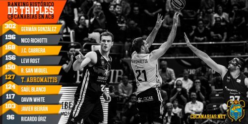 La Laguna (Tenerife), 30 de abril de 2018 – Solamente necesitaba un triple para deshacer su empate con Saúl Blanco en la séptima posición de máximos triplistas aurinegros de la historia de la ACB. Pero Tim Abromaitis firmó tres ante el Gran Canaria, para situarse ya en solitario en ese sexto puesto con 127 frente a los 302 del legendario escolta Germán González, que sigue encabezando el Top-10 histórico desde que dejara de ser jugador del Canarias en el año 1991.