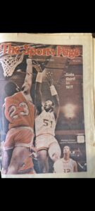 En otro recorte, el rival es la Universidad de Virginia. El texto recuerda una defensa asfixiante, un intercambio constante de ventajas… hasta que, en el momento decisivo, “Eddie Phillips stuff sealed the Cavs’ fate”: un mate que selló el pase a la siguiente ronda. La fotografía capta el instante, Eddie colgado del aro, con la expresión de quien sabe que ha cambiado el destino del partido.