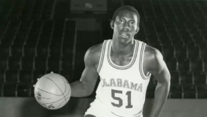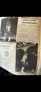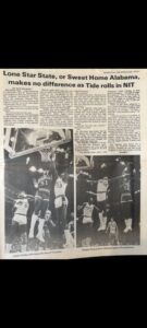 En esta ocasión, los recortes hablan del National Invitational Tournament (NIT), disputado en la primavera del lejano año 1979. La tinta y las fotografías en blanco y negro devuelven la imagen de un joven Phillips, con el dorsal 51, suspendido en el aire, buscando el aro con la determinación de quien sabe que cada punto cuenta. La primera historia nos lleva a Houston, donde Alabama se medía a los Aggies de Texas A&M. La crónica describe un partido duro, de golpes y respuestas, y ahí estaba Eddie, sumando 17 puntos, atacando la canasta con la misma fuerza con la que más tarde dominaría la zona en la Liga ACB con la camiseta del Canarias. “Eddie Phillips hits layup for two of 17 points”, titula la imagen que lo muestra superando a su defensor en pleno vuelo.