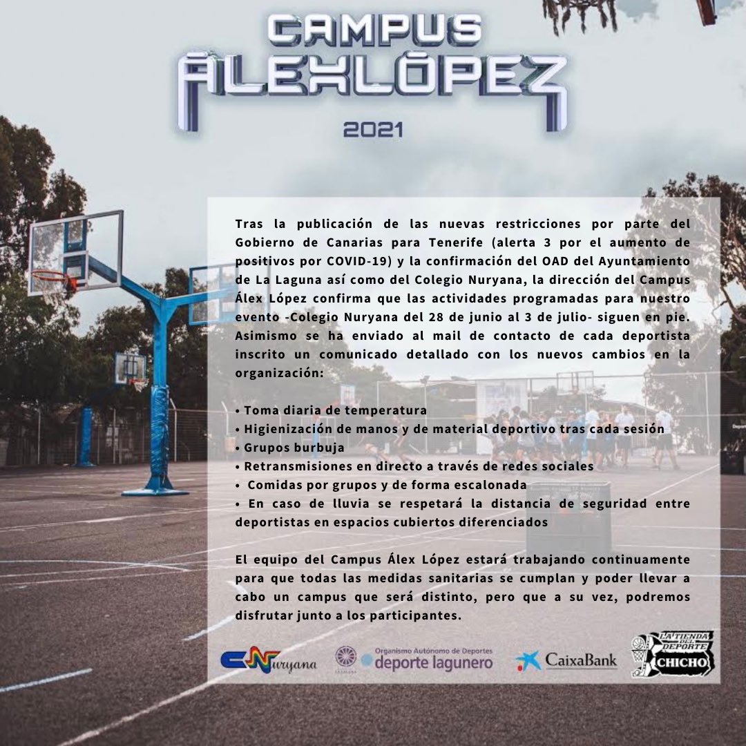 El Campus Álex López sigue adelante. La organización del evento ha hecho público un comunicado en el que se especifica la adaptación del mismo al nivel 3 decretado por la pandemia de la Covid-19 en la isla de Tenerife. Es el siguiente: