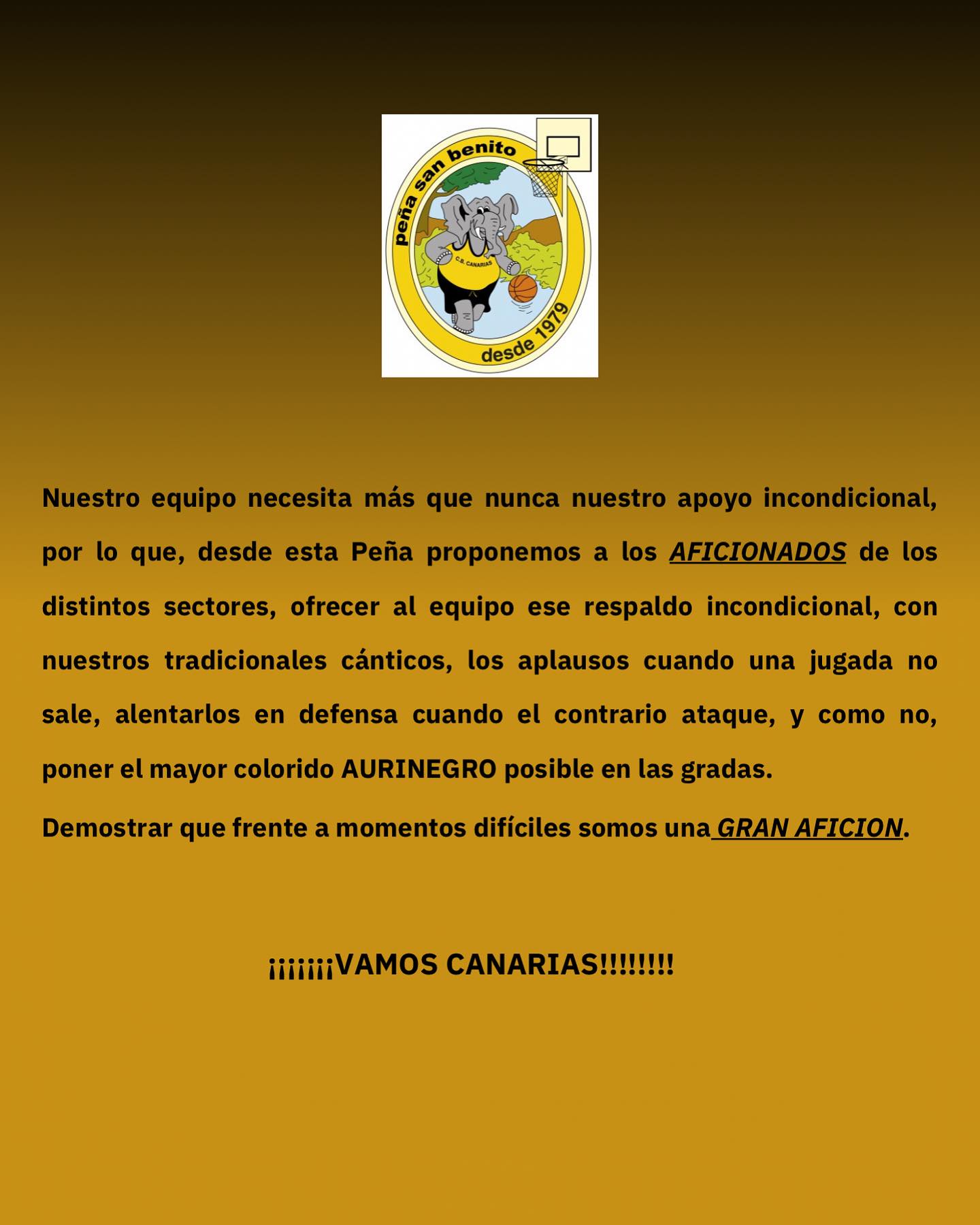 Por ello, la Peña San Benito ha hecho un llamamiento a los componentes de la Fiebre Amarilla para que hagan del recinto deportivo lagunero una olla a presión. ”Nuestro apoyo necesita más que nunca nuestro apoyo incondicional. por lo que , desde esta Peña proponemos a los aficionados de los distintos sectores, ofrecer al equipo ese respaldo incondicional», comienza diciendo el manifiesto del grupo animador fundado en 1979.