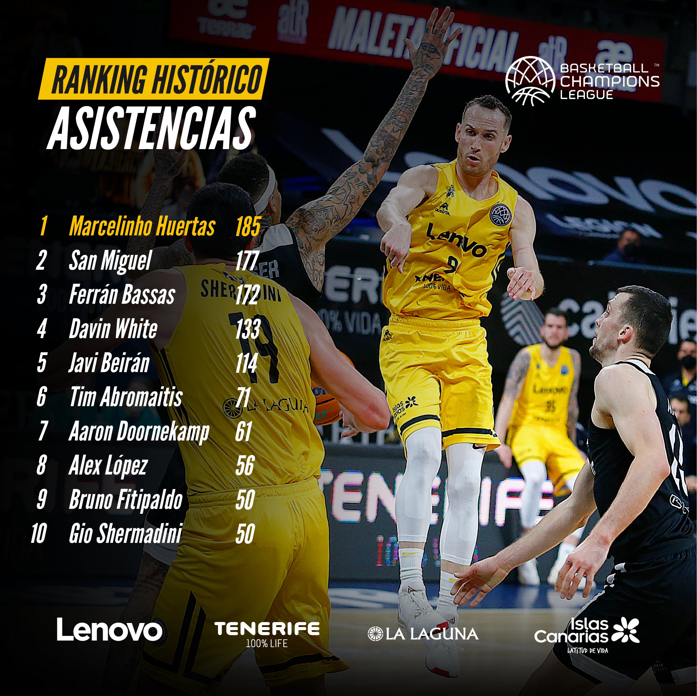 La calidad y el talento del base aurinegro del Lenovo Tenerife parece no tener límites. En la noche de ayer, el ex jugador de Los Angeles Lakers registró otro dato para los anales aurinegros, convirtiéndose en el jugador con más asistencias de la historia del equipo lagunero en la Basketball Champions League. El base carioca ha repartido la friolera de 185 asistencias en 25 partidos disputados, o lo que es lo mismo da a sus compañeros 7’4 asistencias por partido.