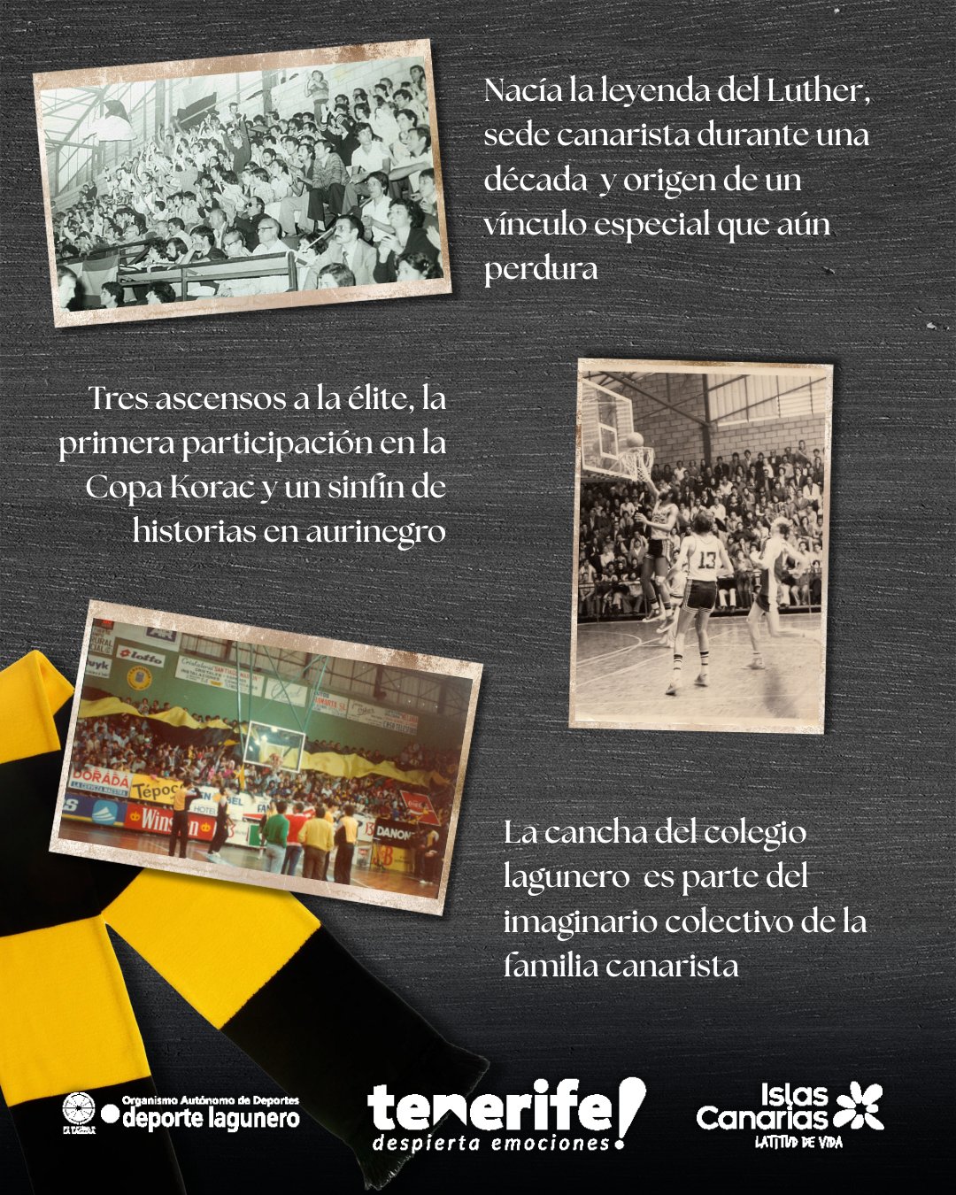 El Luther se consolidaba así como un foco de prestigio cestista a nivel nacional y como la casa oficial del equipo aurinegro durante una década, concretamente hasta finales del ejercicio 85/86. Un idilio cuyo último capítulo coincidió además con el tercer ascenso canarista a la élite, antes del traslado al Juan Ríos Tejera. Precisamente esas dos referencias, el Luther King y el mencionado ascenso del 86 como cierre oficial a un decenio completo de partidos en el recinto lagunero, inspiran la equipación especial que La Laguna Tenerife vestirá en la próxima Copa del Rey de Valencia 2026. Un guiño al pasado, un tributo a nuestras raíces.