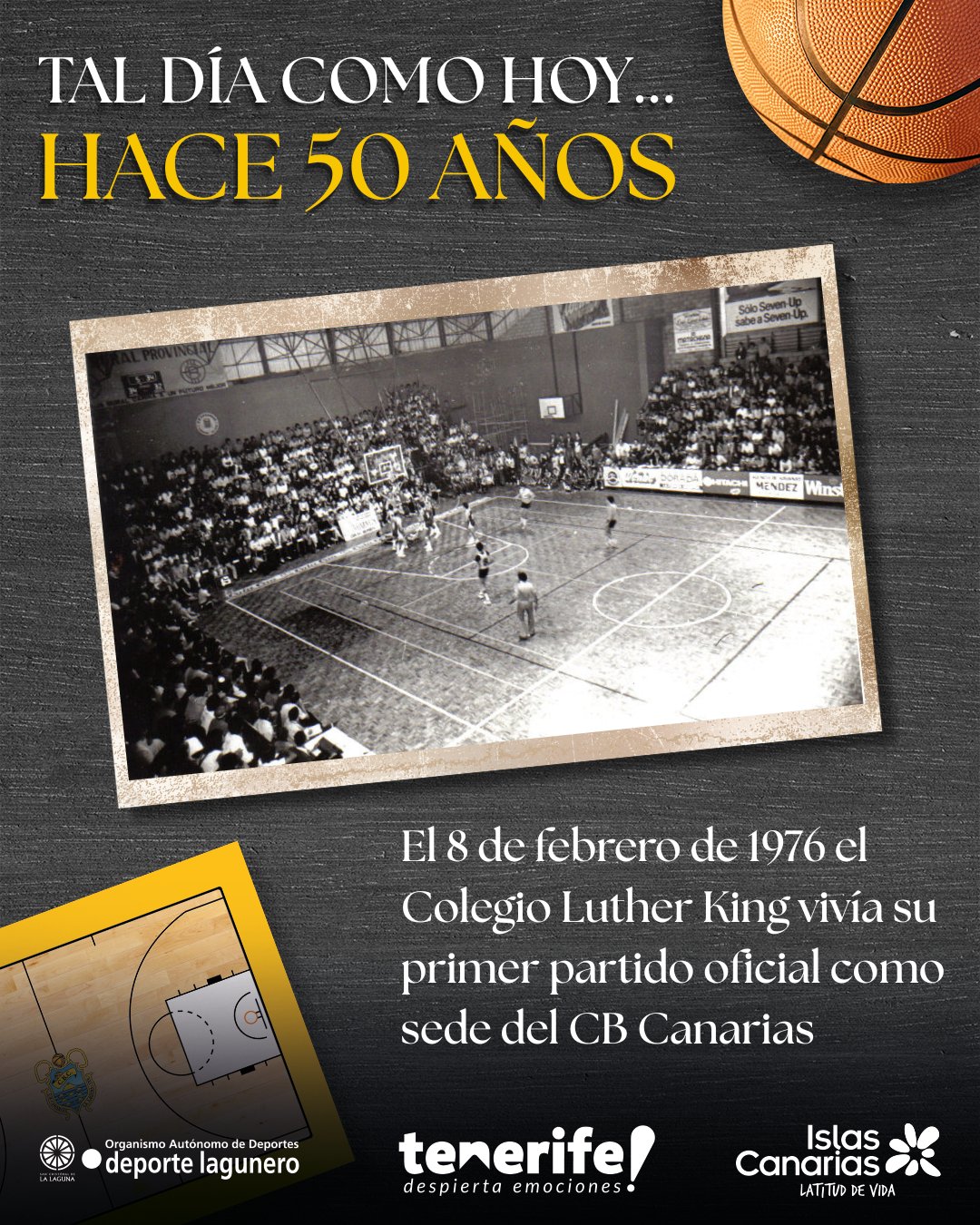 Un aniversario especial. Tal día como hoy (por ayer) , un 8 de febrero, pero de hace 50 años, en 1976, el Luther King vivía el primer partido oficial de su historia como sede del CB Canarias. Un triunfo del equipo aurinegro, entonces dirigido por Pepe Cabrera, ante el Bosco de La Coruña (73-56), en el recién creado Grupo Único de la Segunda División Nacional, suponía el pistoletazo de salida a una estrecha relación entre el colegio lagunero y el club canarista.